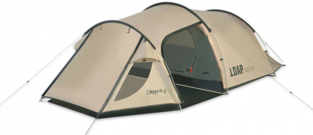 Dvouplášťový stan Loap CAMPA 3 s durawrapovou konstrukcí má jednu ložnici a dvě prostorné předsíňky se dvěma vstupy. Je vhodný na stanování ve třech lidech. Vnější stan je vyroben z nepropustného polyesteru, vnitřní stan naopak z prodyšného polyesteru. Podlážka je z lehkého, přesto velmi odolného materiálu Oxford. Vysoce kvalitní polyuretanový zátěr DRYTECH s mikroporézní strukturou je velmi pevný v tahu i odolný proti protržení. Stan se zátěrem DRYTECH vás spolehlivě udrží v suchu v nepříznivých klimatických a povětrnostních podmínkách. Konstrukce stanu je ze 7,9/8,5 mm durawrapu, který je výrazně pevnější a pružnější než klasický sklolaminát. Durawrapové tyčky mají nezaměnitelný kosočtvercový vzor, jsou navíc obalené bužírkou a na koncích mají kovové spojky.