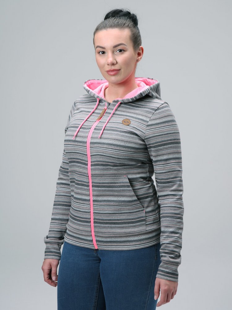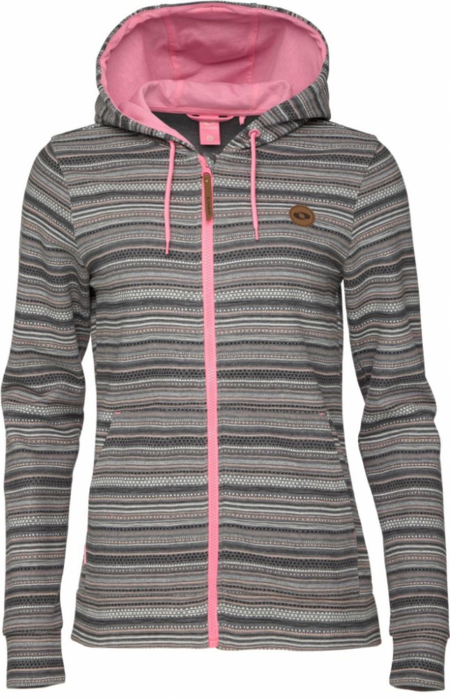 Dámská mikina Loap ECULA s kapucí je univerzálně využitelnou mikinou do města i na volnočasové aktivity. Mikina je ušitá v klasickém střihu s celorozepínáním na kostěný zip. Materiál z bavlny a polyesteru zajišťuje komfortní nošení, současně dobře drží tvar, méně se mačká a tím i snáze udržuje. Spodní okraj a rukávy jsou volné, bez stahování, zatímco pevnou kapuci lze uzpůsobit pomocí tkaniček. Mikina disponuje dvěma kapsami a celkový vzhled dotváří proužkovaný vzor. Vhodná na celoroční nošení.
