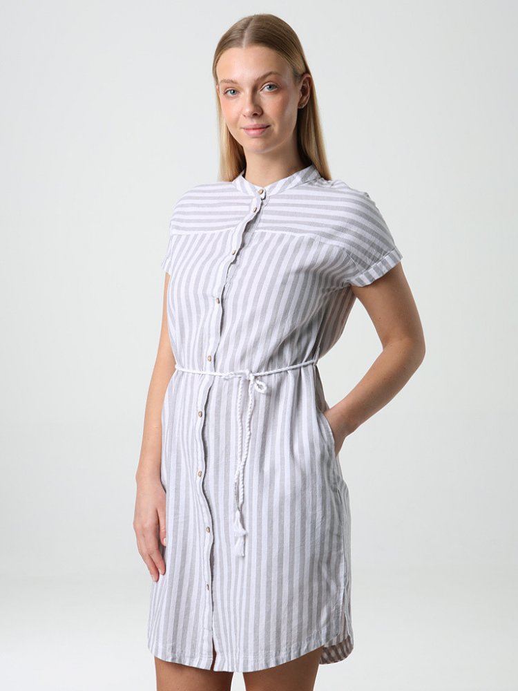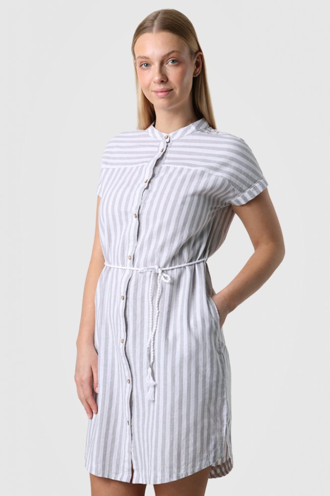 Lněné dámské šaty s límečkem NESHA mají po celé délce zapínání na knoflíčky a vysoký rozparek pro pohodlný krok. Stahují se páskem, ale dají se nosit i na volno bez něj. Na bocích mají dvě otevřené kapsy. Ušité jsou v klasickém střihu ze lnu (55 %) a bavlny (45 %) v lehké gramáži 150 g/m2. Tyto pruhované letní šaty s minirukávkem jsou pevné, přesto prodyšné a skvěle odvádí teplo i vlhkost. Dobře d...