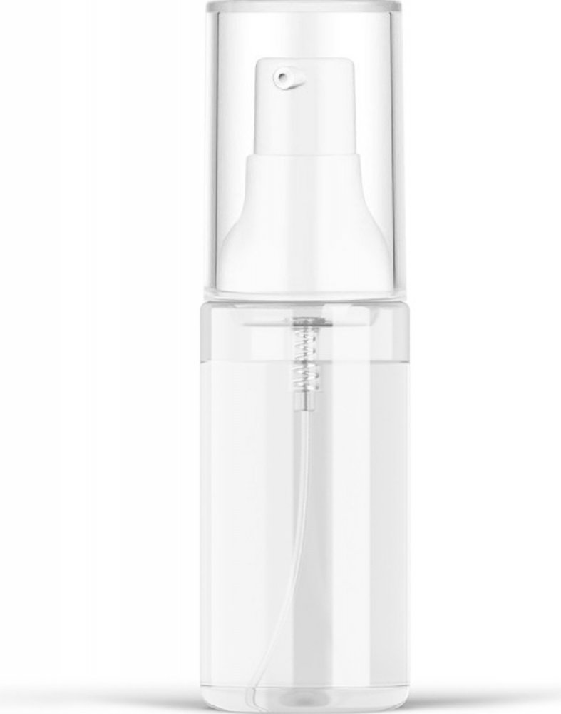 Prázdná lahvička s pumpičkou a těsnícím víčkem, díky které si s sebou můžete vzít na cesty AHA Peeling, tělový olej, sprchový gel i šampony.