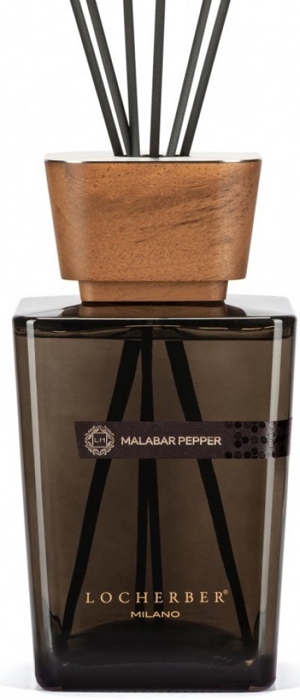Locherber vonný difuzér s tyčinkami s objemem 2,5 litru ve velkém skleněném flakonu s dlouhými tyčinkami a víčkem z ořechového dřeva noce canaletto je krásným doplňkem každého interiéru. Vůně Malabar pepper se hodí i do restaurací či barů.