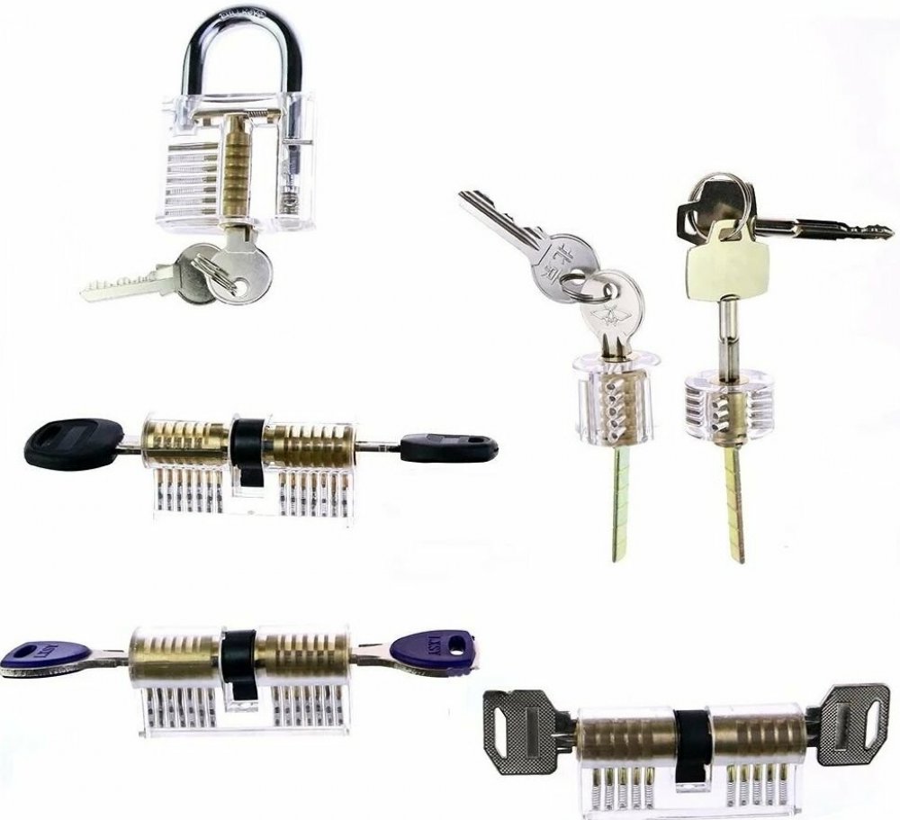 Souprava šesti různých typů průhledných trénovacích zámků s klíči pro trénink lockpickingu.