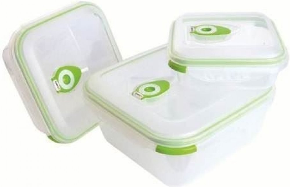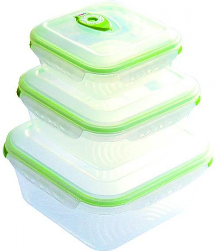 Praktická sada, která obsahuje tři čtvercové dózy o objemu 700 ml, 1500 ml a 3000 ml. Jak uzavřít: Přiklopte dózy víkem a upevněte ho pomocí klipsů, uzavřete ventil na víku a stlačením dóz z nich vytlačte vzduch. V takto uzavřených dózách prodloužíte čerstvost potravin až o 40%. Ideální na skladování ovoce, zeleniny, sýra, šunky a dalších potravin, které se rychle kazí či osychají. Dózy dokonale chrání potraviny před vlhkostí, oxidací a vnějšími vlivy, které se podílí na kažení, osychání a plesnivění. Dózy můžete dávat do ledničky i mrazáku. Lze v nich i ohřívat či rozmrazovat jídlo v mikrovlnné troubě (předtím z nich sundejte víko).