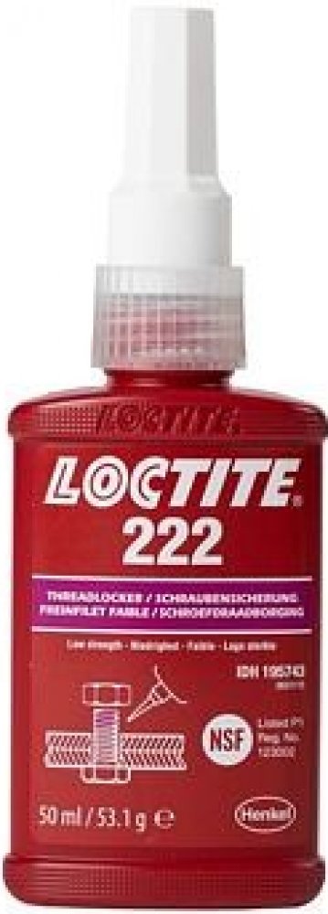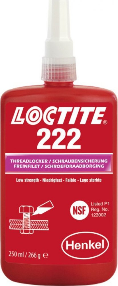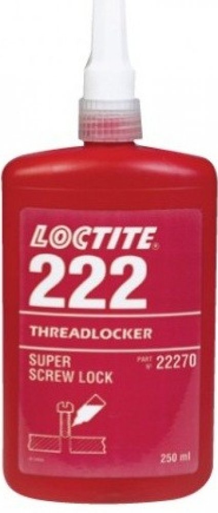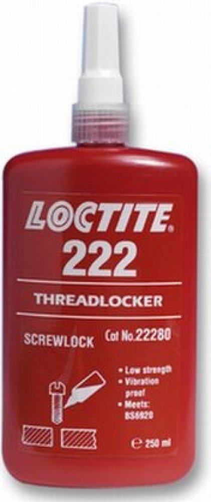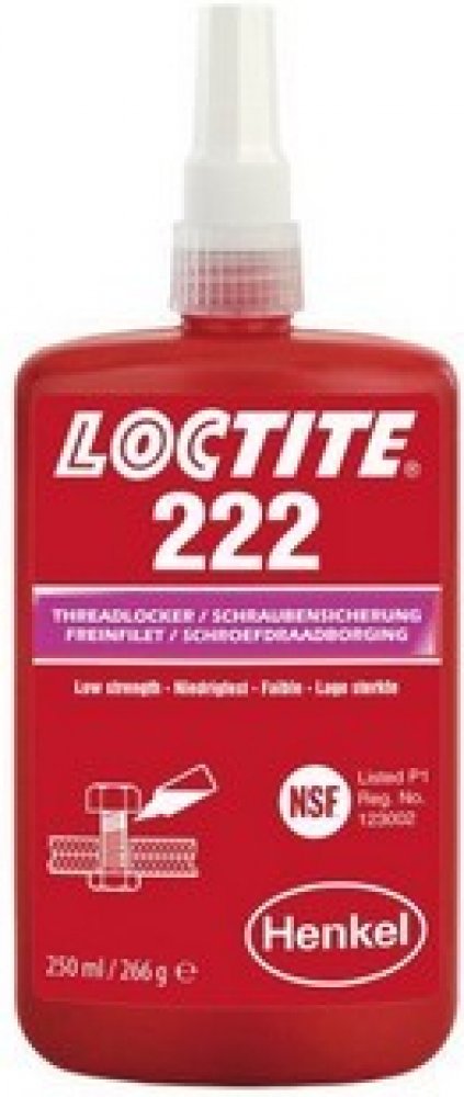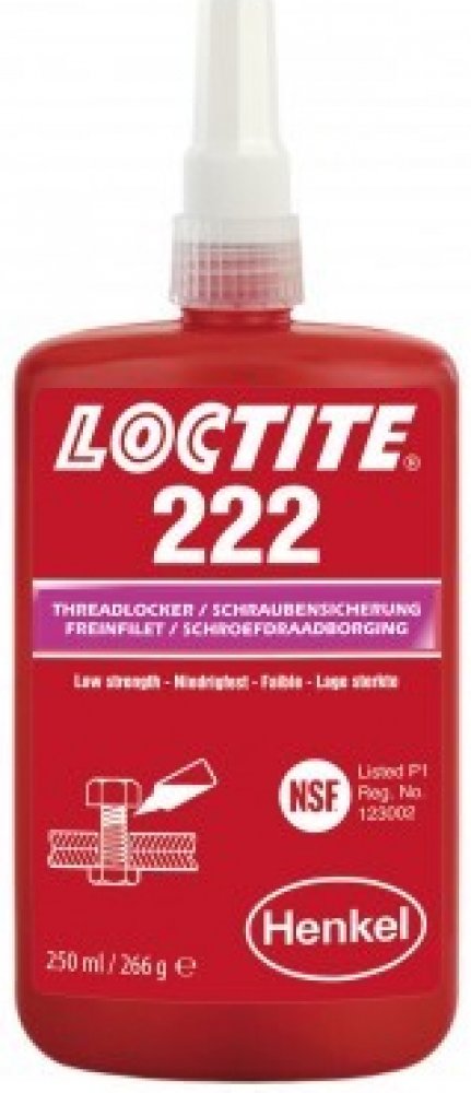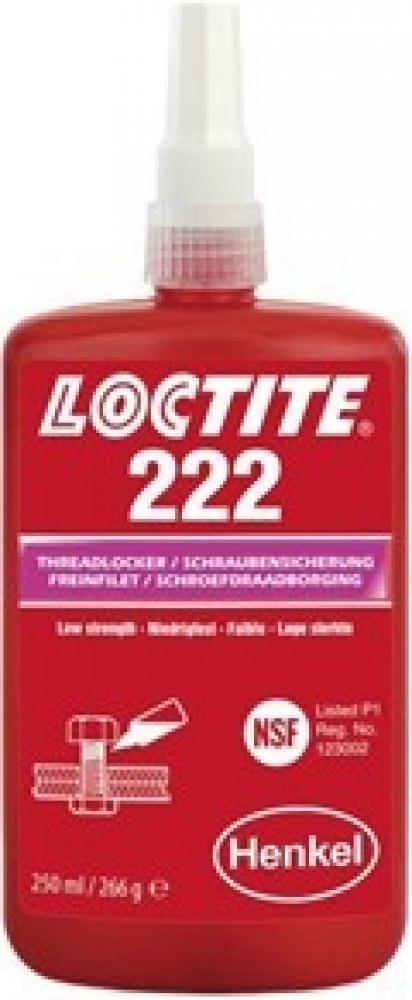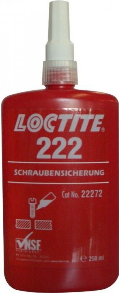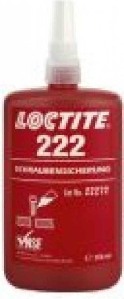 LOCTITE® 222 je určen pro zajišťování a těsnění závitových spojů které vyžadují snadnou demontáž za použití běžného ručního nářadí. Produkt vytvrzuje bez přístupu vzduchu ve spáře mezi lepenými kovovými povrchy a zabraňuje uvolnění či prosakování spoje, které je způsobené vibracemi a rázy. Je zejména vhodný pro takové aplikace, jako je zajištění stavěcích šroubů, závitů malého průměru nebo dlouhých závitových spojů, kde je požadována snadná demontáž bez poškození šroubu. Tixotropní charakter LOCTITE® 222 zabraňuje jeho stékání z místa nanesení.