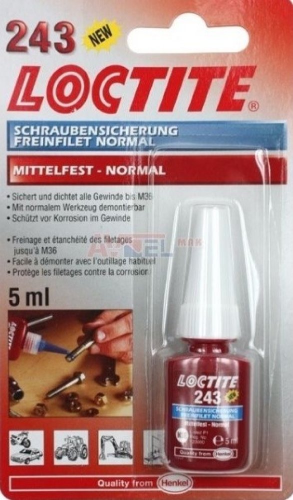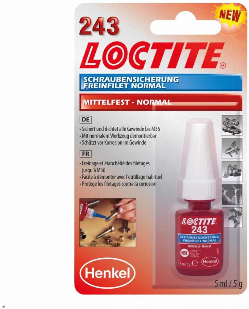 Loctite 243 je nejprodávanější zajšťovač na trhu. Je vhodný pro méně aktivní povrchy, jako je nerezová ocel nebo pokovené povrchy. Produkt nabízí zvýšenou odolnost vůči teplotě a větší toleranci k mírně zamaštěným povrchům. Tixotropní charakter zabraňuje jeho stékání z místa nanesení.