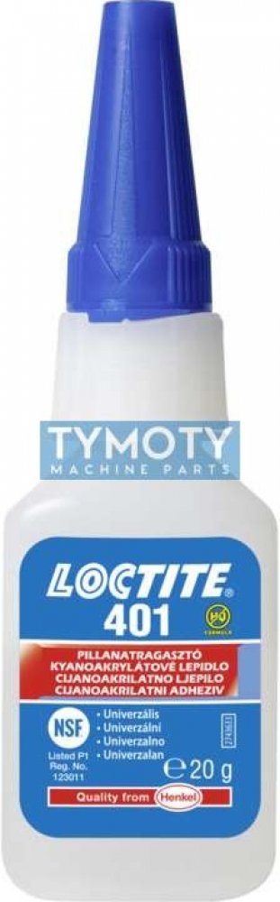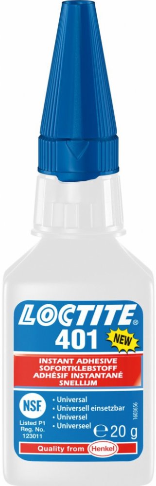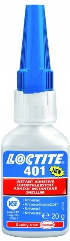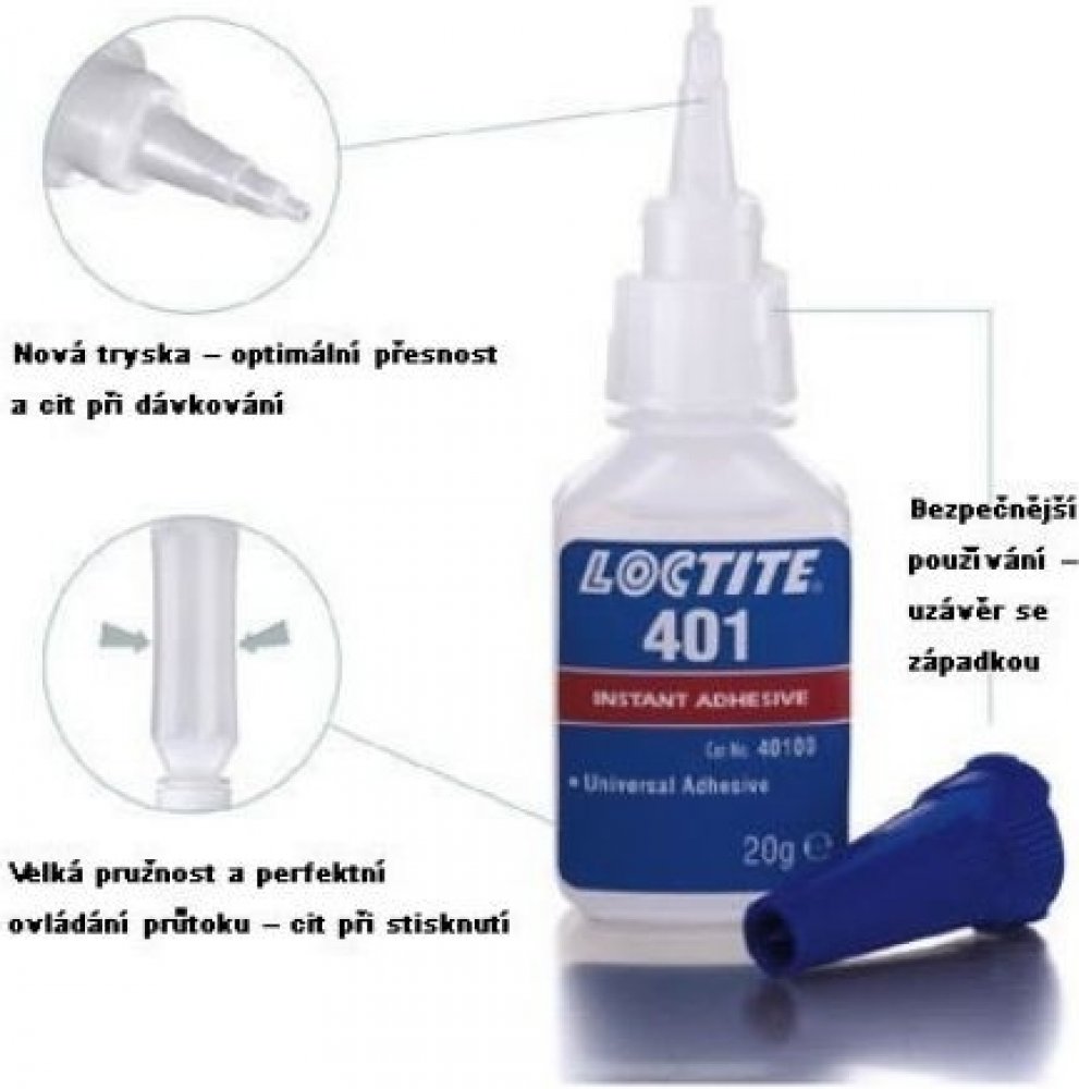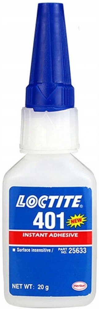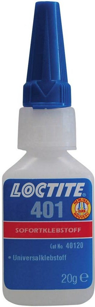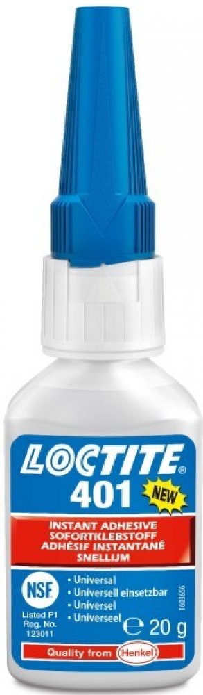 LOCTITE 401 Vteřinové lepidloLOCTITE 401 je univerzální vteřinové lepidlo s rychlým vytvrzením, které je vhodné i na lepení porézních povrchů.LOCTITE® 401 je vteřinové lepidlo s rychlým vytvrzením, které je určeno ke spojování obtížně lepitelných materiálů, které vyžadují rovnoměrné rozložení zátěže a vysokou pevnost v tahu a střihu. Tento produkt umožňuje rychlé lepení široké škály materiálů, včetně kovů, plastů a elastomerů. LOCTITE 401 je rovněž vhodný pro lepení porézních materiálů, jako je dřevo, papír, kůže a textilie. Ideální pro rychlé opravy.