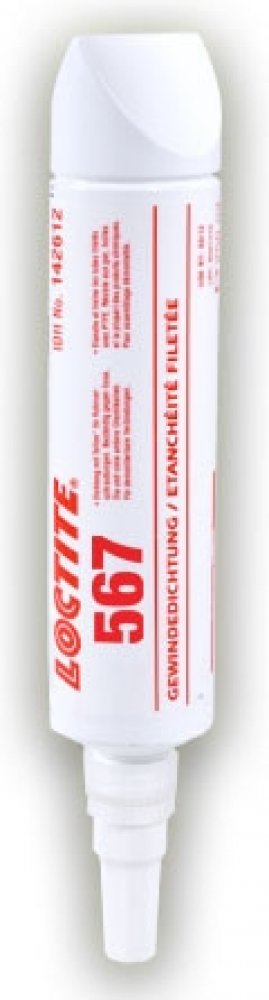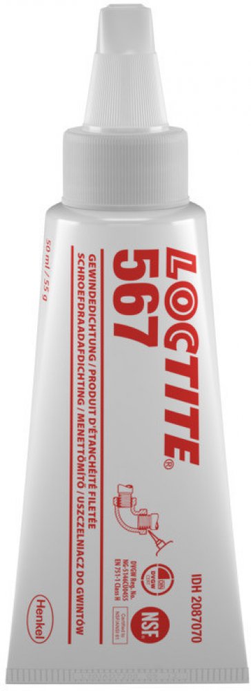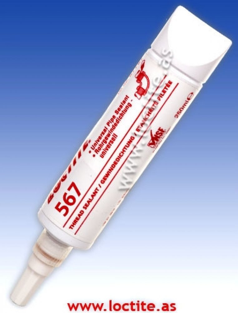 Loctite 567 je speciální vysokoviskózní akrylátové těsnění na kuželové (kónické) závity kovových trubek a tvarovek (např. z nerezové oceli, hliníku) až do rozměru závitu M80. Tento produkt je hladká našedlá pasta s nízkou pevností, která vytvrzuje bez přístupu vzduchu ve spáře, odolává vibracím a rázům a zabraňuje uvolnění či prosakování spoje.