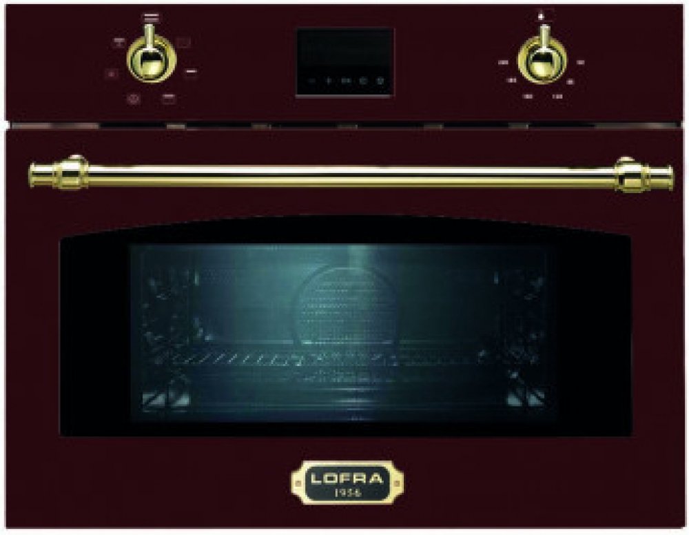 Retro multifunkční kompaktní trouba Lofra FMRR66ME, vestavěná, barva červená BURGUNDY, multifunkce - gril, horkovzduch, mikrovlny, ší­ře 60 cm, výška 44,6 cm, 6 programů, objem trouby 38 l, Teplotní rozsah 40-220°C, vnitřní osvětlení, LED displej, zlaté doplňky.