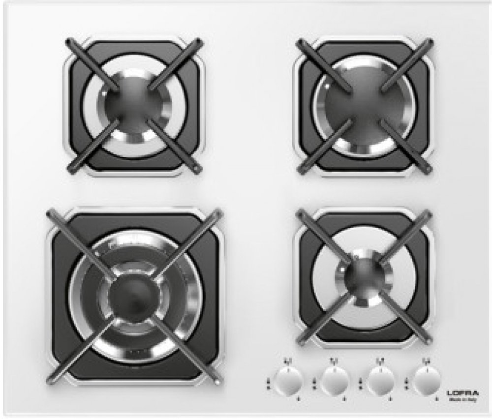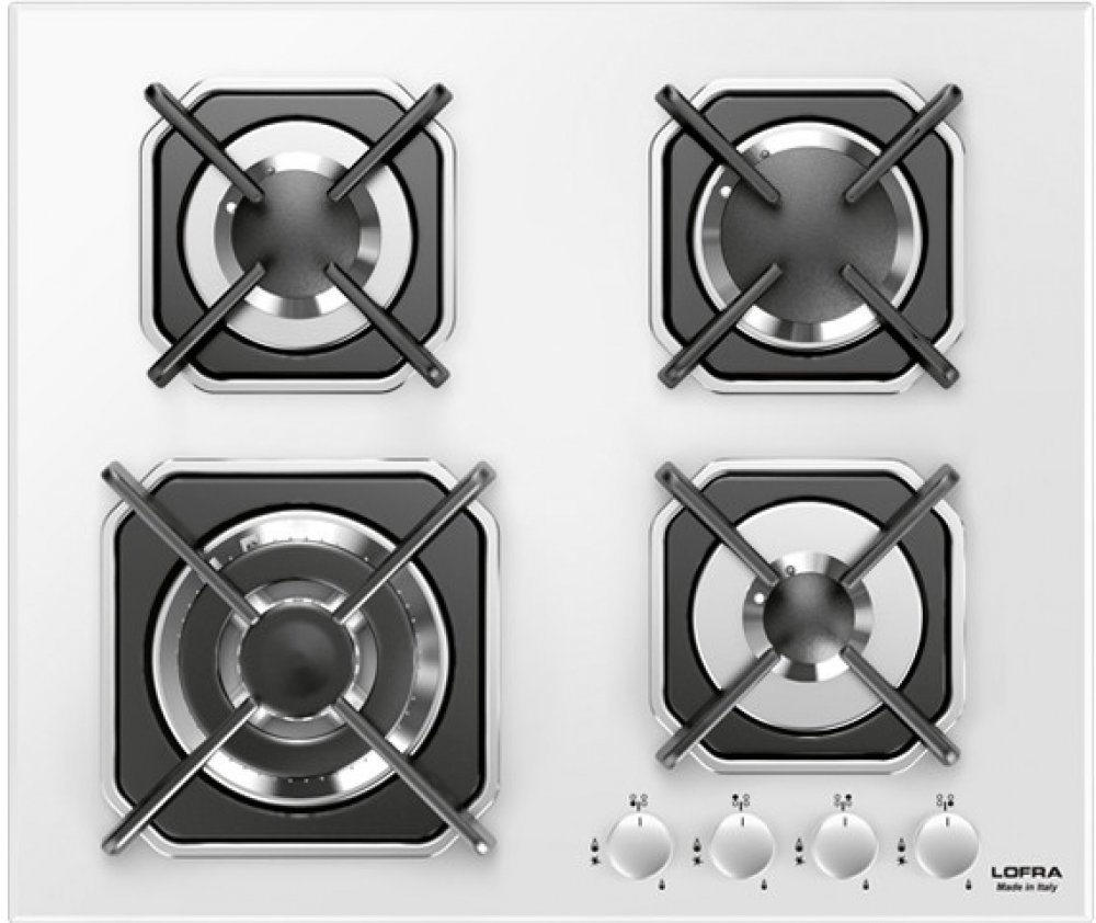 Plynová varná deska Lofra HGB6G0, ší­ře 60 cm, vestavná, barva bílé sklo, doplňky barva nerez, 4 hořáky z toho 1 turbo, ovládání knoflíky vpředu.