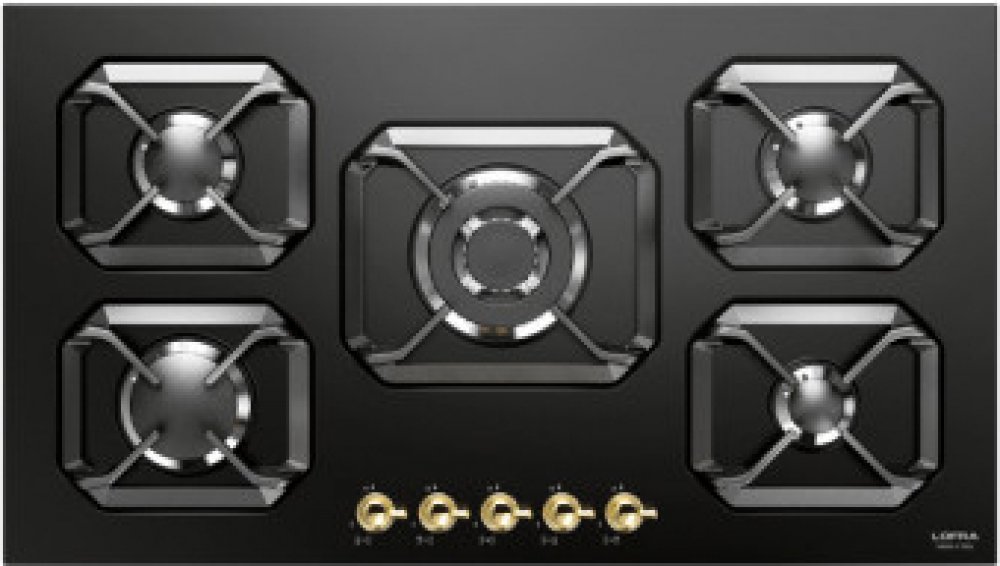Plynová retro varná deska Lofra HRNM7A0 , ší­ře 90 cm, vestavná, barva černá matná, doplňky zlato, 4 hořáky + 1 turbo, ovládání knoflíky v předu.