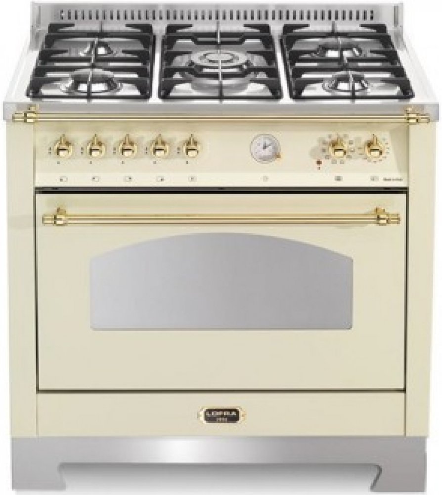 Retro sporák kombinovaný Lofra RBIG96MFT/Ci, volně stojící, plynová deska a elektrická trouba, barva krémová, doplňky - zlaté, ší­ře 90 cm, teleskopické výsuvy, 5 hořáků, objem trouby 101 l, energetická třída A.