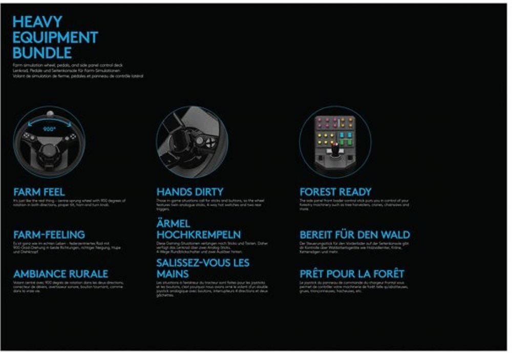 The Logitech G Heavy Equipment Bundle is an impressive stable of specialized farm simulation gear. All the essential tools are here: 900°wheel, rugged pedals, and a side panel for realistic immersion and enjoyment. In partnership with GIANTS Software and the Farm Sim community (That’s you!), we amplified the thrill of cultivating land, nurturing livestock, and selling goods. And, not only for machinery! Get your hands dirty with sticks and buttons built into the wheel for in-game farmer tasks, like powering a chainsaw. It’s all here and all for the most rewarding agri-adventure possible. Now updated with engineering enhancements that address feedback from the community, the Heavy Equipment Bundle is ready for the rigors of life on the farm.