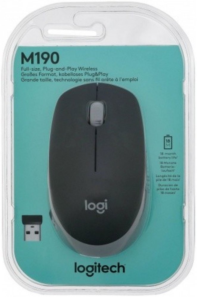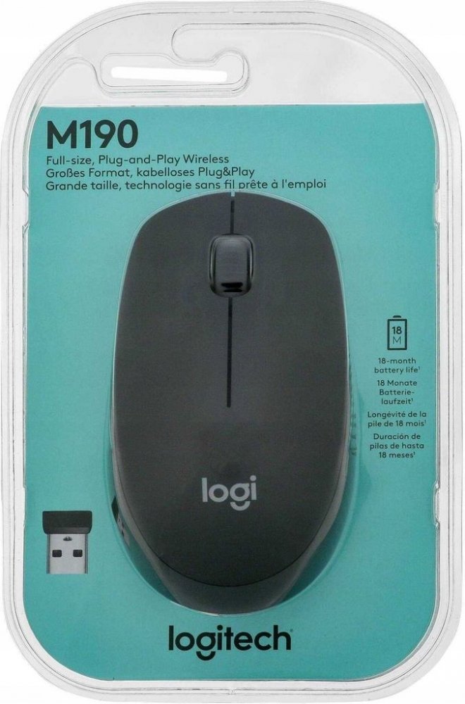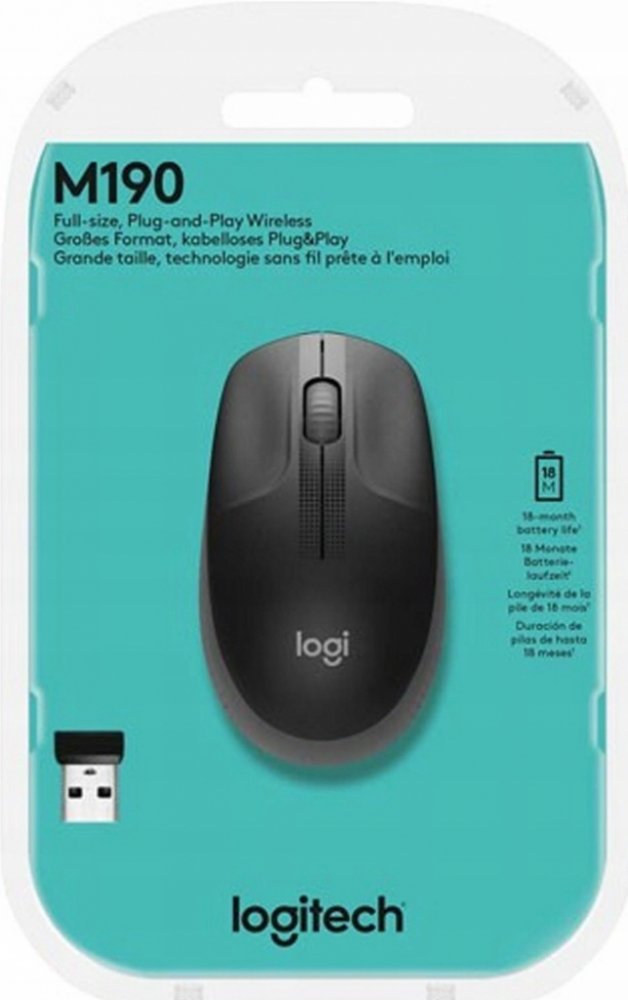 Logitech M190 je bezdrátová myš plnohodnotné velikosti s pohodlným profilovaným tvarem, který kopíruje přirozené zakřivení středních a velkých rukou. Budete moci pracovat bezdrátově a volně se pohybovat – na vzdálenost až 10 metrů – prakticky bez zpoždění a výpadků. Tato kvalitní myš nabízí až 18měsíční výdrž baterie, přesné snímání a posun řádek po řádku za dostupnou cenu.