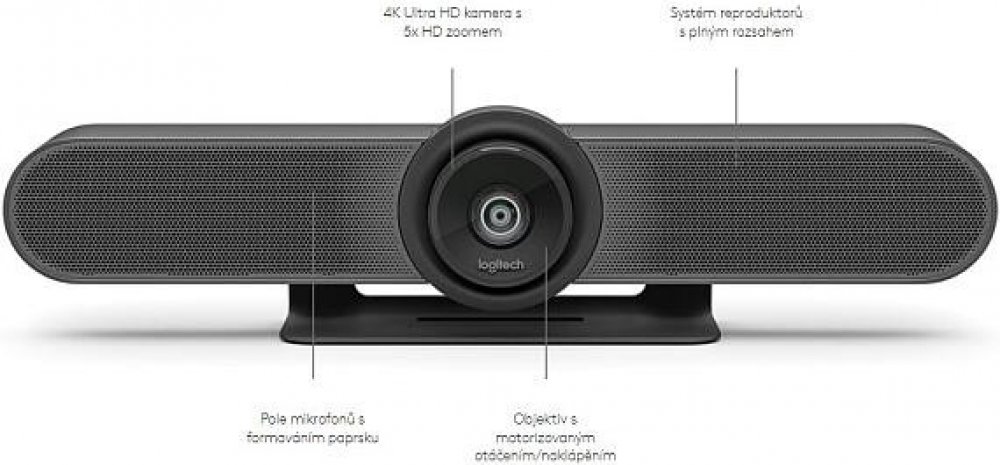 Kamera Logitech® MeetUp přináší špičkovou kvalitu obrazu do malých konferenčních místností. Její ultraširoké zorné pole umožňuje snadno zabrat prostor malých místností, kde lidé sedí po obou stranách kamery. Senzor s ultravysokým rozlišením 4K a objektiv Logitech poskytují dokonalou ostrost obrazu, a ovládací prvky otáčení, naklápění a zoom umožňují zaostřit na prezentujícího a jeho vizuální pomůcky.