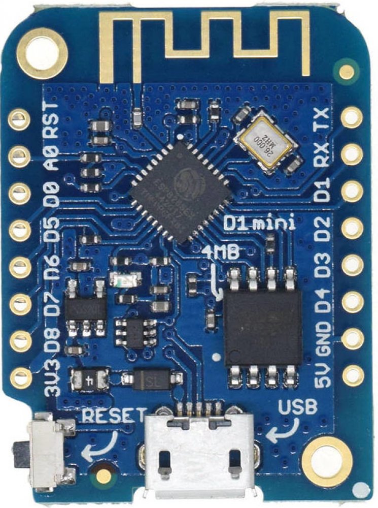 Wemos D1 Mini je Wifi vývojová breadbord kompatibilní deska, založená na ESP8266EX. Deska je kompatibilní s Arduino IDE a s NodeMCU. Všechny I/O piny mají přerušení, PWM, I2C a 1-Wire , mimo pin D0. Deska je dodávána se třemi různými sadami pinů: dlouhý pin - samice, standardní pin - samice a pinů - samec. My máme nejraději hlavičky dlouhý pin- samice, protože umožní připojit desku do breadboardu a zároveň mohou být hlavičky - samice na vrchní straně desky. Deska má USB Micro konektor a USB pro sériový (UART) převodník, takže je jednoduché tuto desku připojit ke svému počítači pomocí USB Micro kabelu. Specifikace: Mikrokontrolér ESP8266EX USB - Serial Převodník CH340G Digitální I/O Piny 9 Analogové Vstupy 1 Flash 4MB Rozměry Délka 34.2mm Šířka 25.6mm Výška 7mm Váha 8.26g WeMos Pin Funkce ESP8266 Pin TX TXD TXD RX RXD RXD A0 Analogový vstup A0 D0 I/O GPIO16 D1 I/O, SCL GPIO5 D2 I/O, SDA GPIO4 D3 I/O, 10k pull-up GPIO0 D4 I/O, 10k pull-up, LED GPIO2 D5 I/O, SCK GPIO14 D6 I/O, MISO GPIO12 D7 I/O, MOSI GPIO13 D8 I/O, 10k pull-down, SS GPIO15 G Země GND 5V 5V 3V3 3.3V 3.3V RST Reset RST Součásti dodávky: 1ks LOLIN D1 Mini ESP8266 v3.0.0 WiFi modul Poznámka: D1 Mini je 3.3V zařízení. Pokud jej zapojíš do 5V digitálních senzorů nebo zařízení, budete možná potřebovat převodník nízké úrovně, jako jsou naše 4-kanálové nebo 8-kanálové převodníkové moduly. Tento výrobek není samostatně funkčním celkem a může vyžadovat odbornou montáž. Fotografie výrobků jsou pouze ilustracemi na ukázku a někdy se mohou lišit od skutečného vzhledu předmětu. Avšak toto nemění jejích základní vlastnosti.