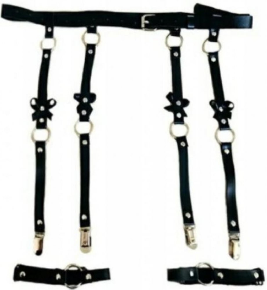Ve spodní části postroje jsou klipy, kterými lze postroj připevnit jak k punčochám, tak k černým stehenním popruhům, které jsou součástí sady.