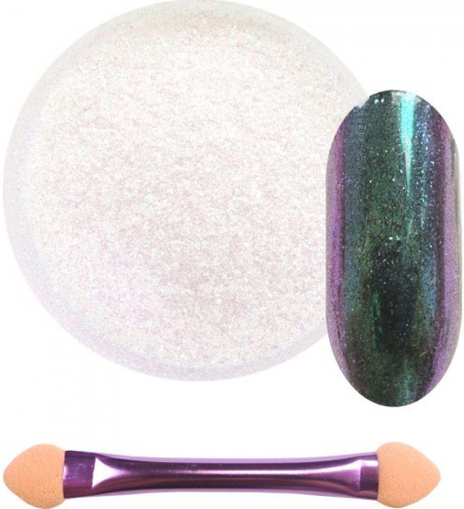 Pigment chameleon pro vytvoření zrcadlových nehtů, které mají zelenofialové odlesky. Nazývá se také glamour pudr. Používejte jej společně s chromovým vrchním lakem. Základní vrstvu gel laku nechte 2 minuty v lampě. Po vytvrzení naneste pudr a pomocí lešticího štětce ho vetřete do nehtu. Nakonec opět naneste vrchní lak. Aplikátor pudru je součástí balení.