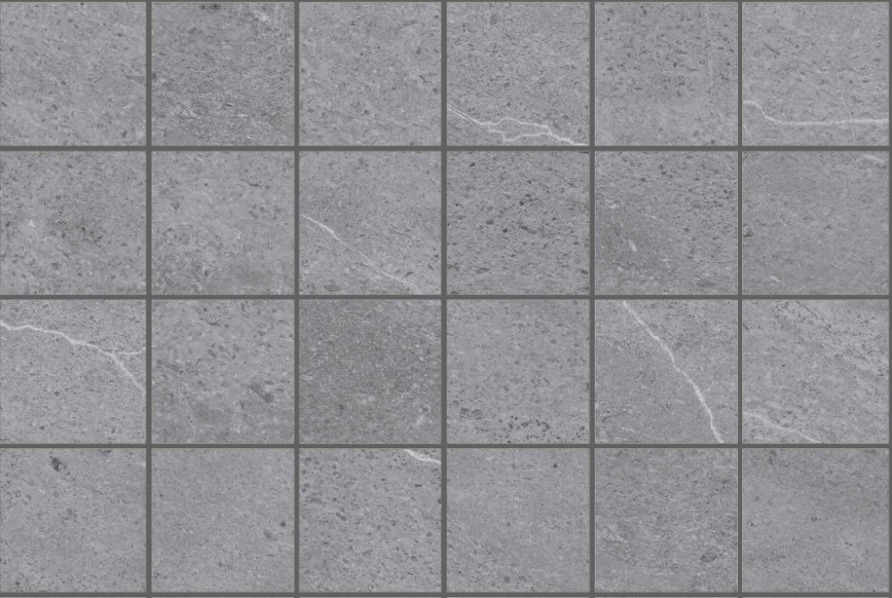 Moderní šedý dekor s mozaikou 10×10 a tmavě šedými frézovanými spárami, které jsou probarvené a uzavřené UV lakem. Lesklý, odolný a snadno čistitelný povrch. Výborně ladí s černými armaturami, dřevem a nerezem – do kuchyní i koupelen.