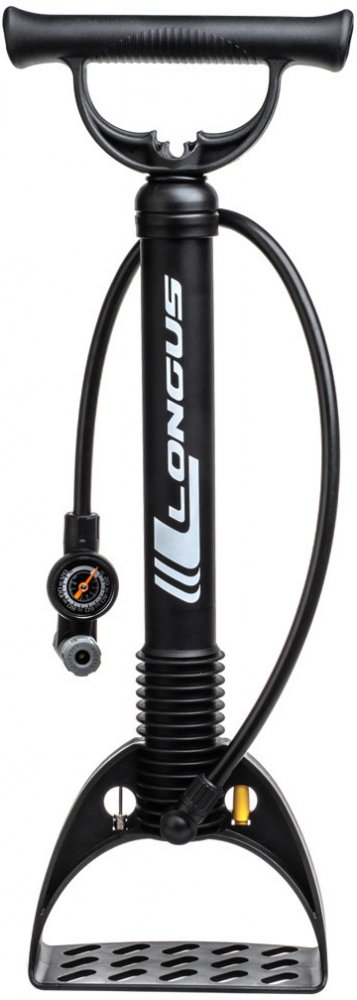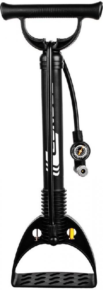 Menší nožní pumpa se zesíleným plastovým tělem a plastovým podstavcem na jednu nohu. Manometr je umístěný přímo u hlavy hadičky a umožňuje tak snadnou kontrolu tlaku.