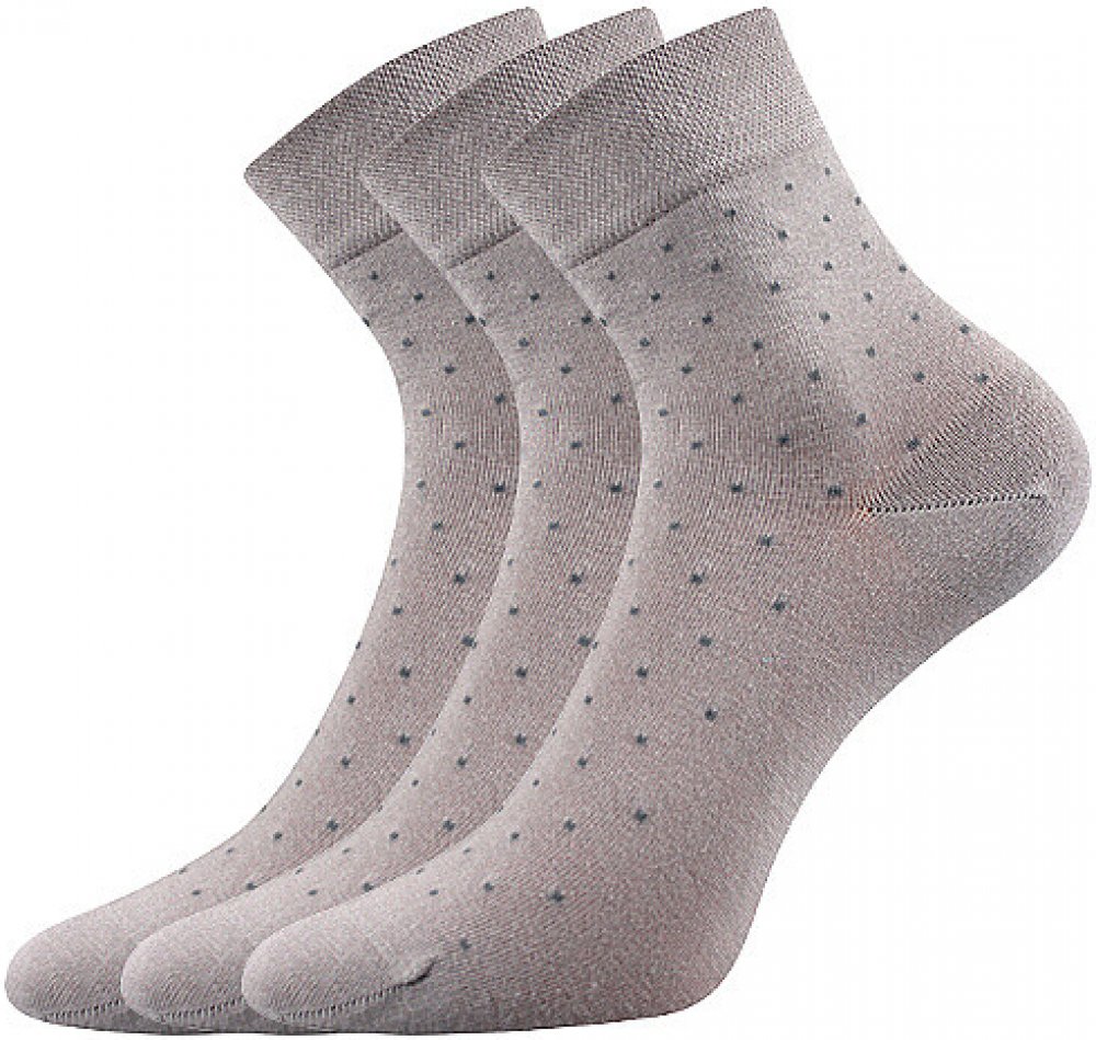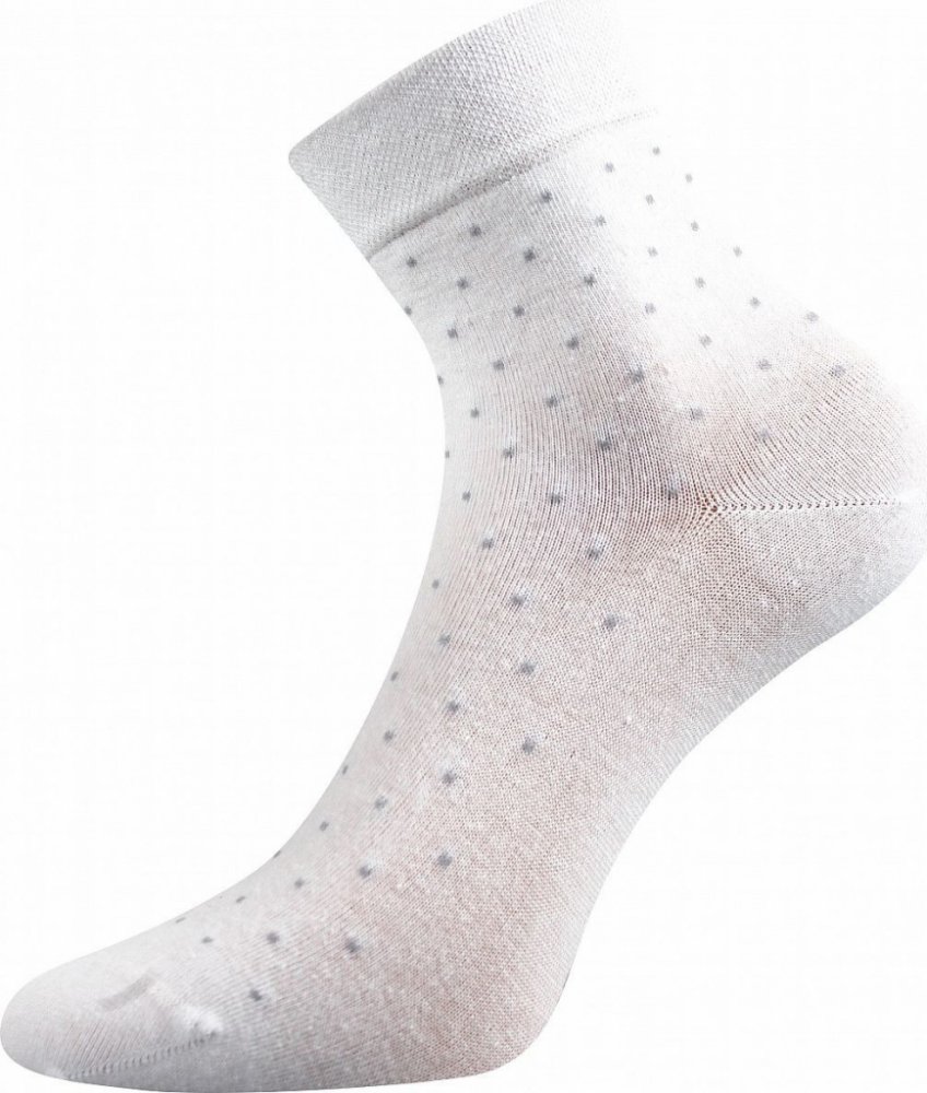 Dámské, společenské ponožky Lonka střední délky mají velmi jemné sevření lemu s řetízkovanou špicí, aby šev netlačil přes prsty ani v úzkých botách. Ponožky mají jemný úplet na 200 jehlách, jedná se o špičkový výrobek. Zdobené jsou decentním tečkovaným vzorem.