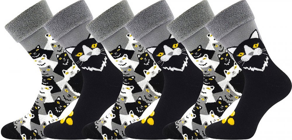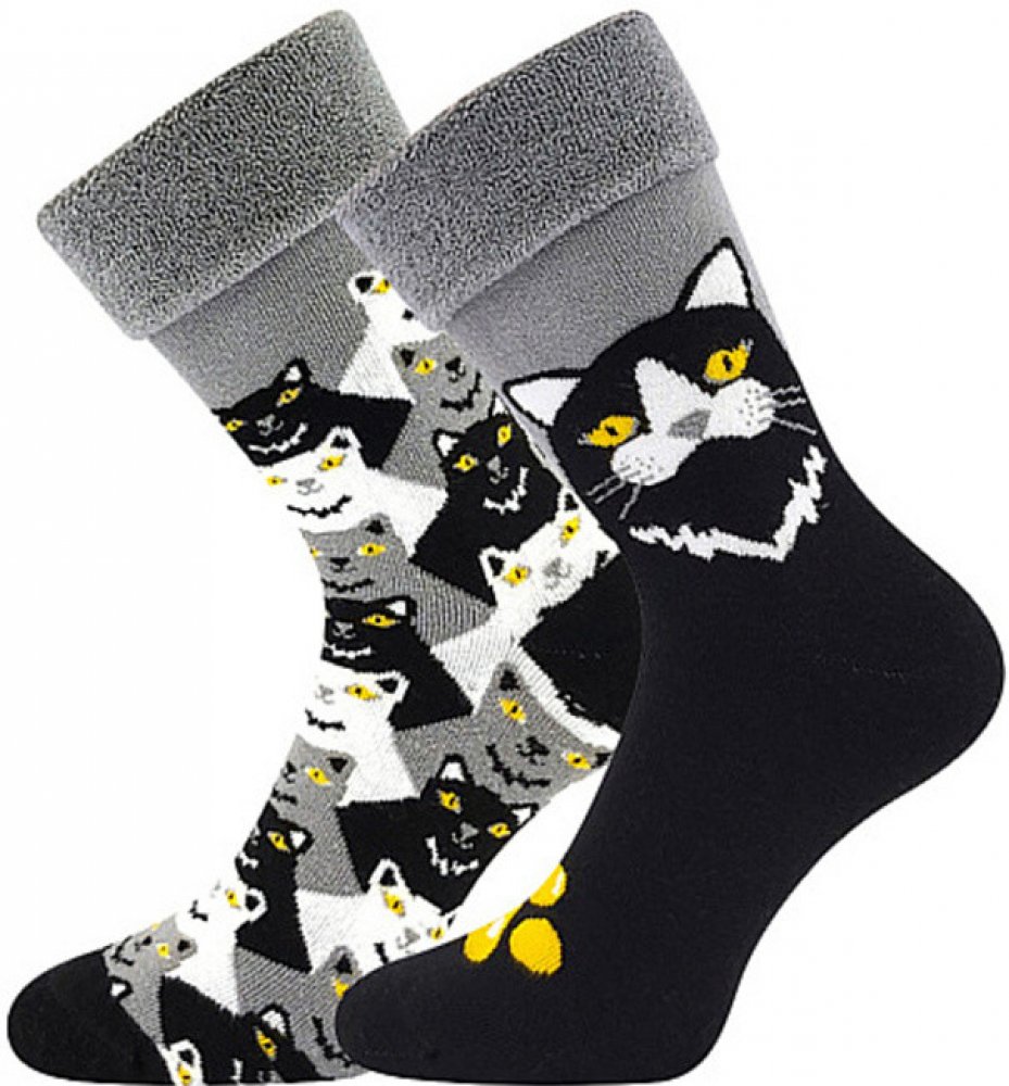 Dámské silné ponožky Lonka® LÍZA s obrázky kočiček. Ponožky mají vysoký podíl bavlny a pružného elastanu. Díky tomu jsou ponožky jemné na omak, příjemné na nošení, dobře pohlcují vlhkost a zároveň dobře drží na noze. Teplé ponožky jsou z jemného a měkkého froté, jsou tak velice příjemné, vhodné na běžné nošení v chladných a sychravých dnech. Špici mají ponožky spojenou řetízkováním a spoj nikde ne...