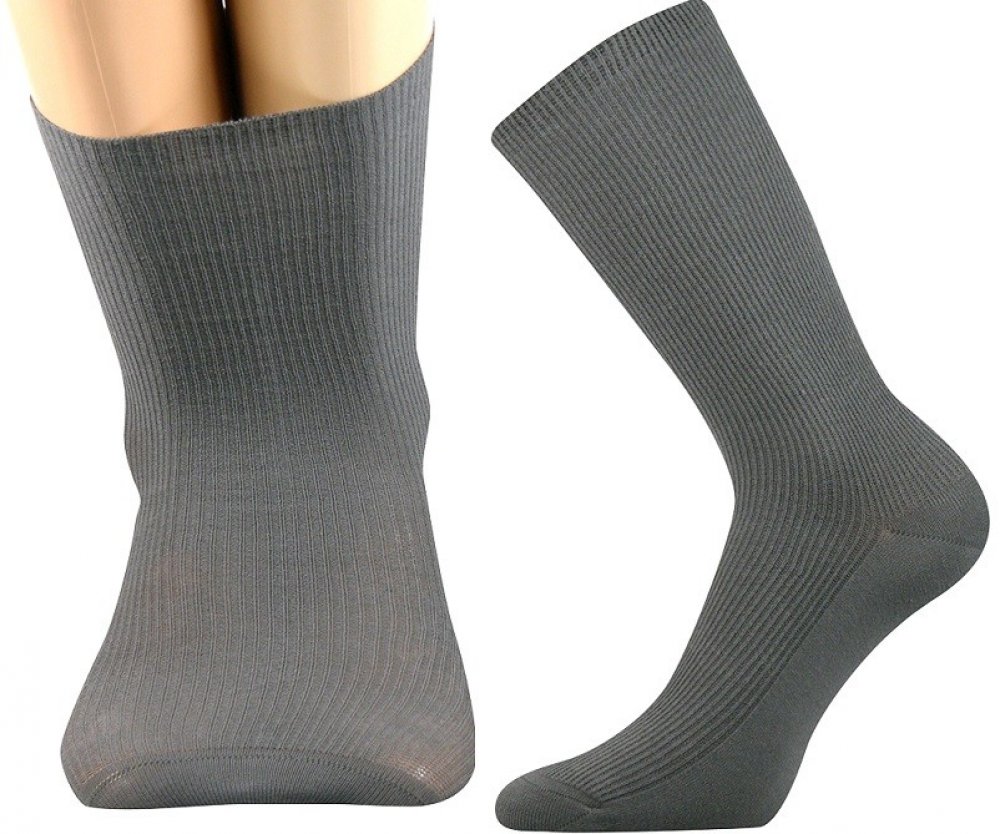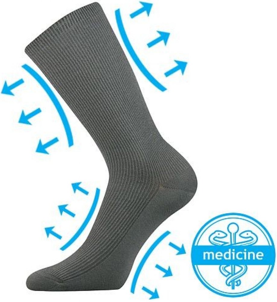 Unisex speciální volné ponožky vhodné pro diabetiky a extrémně oteklé nohy, řetízkovaná bezešvá špice zamezuje otlakům prstů, které mohou vzniknout při klasickém sešití, extrémní roztažnost a volný lem zamezuje otlakům a zaškrcením průtoku krve, žebrovaný úplet.
