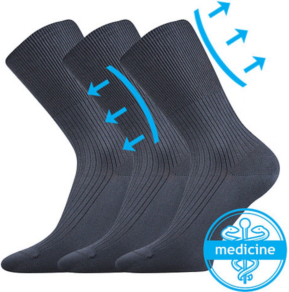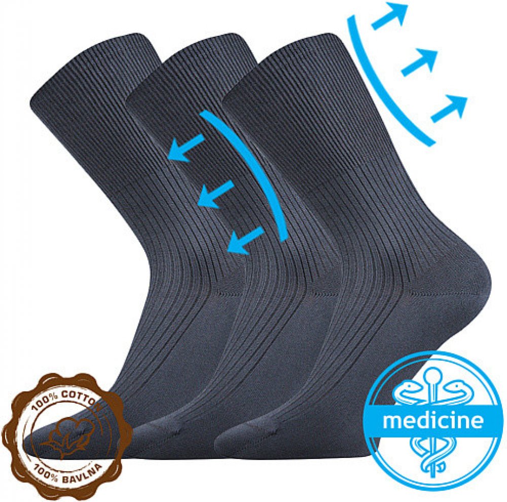 Medicine ponožky Lonka® ZDRAVAN ze 100% bavlny jsou ideální volbou pro oteklé nohy, vhodné i pro diabetiky. Vyšší ponožky z žebrovaného úpletu mají vyšší, speciální, extra volný a nestahující lem, zamezující otlakům a zaškrcení průtoku krve v končetinách. Ponožky ze 100% bavlny neobsahují žádnou příměs, jedná se tedy o čistě přírodní materiál, proto jsou vhodné např. pro ty, kteří trpí plísněmi, e...