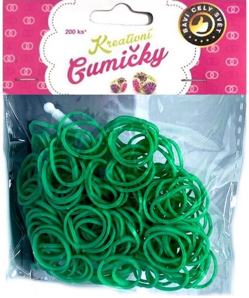 Loom Bands Pletací gumičky zelené 4, 200ks + háček: Buďte originální a vyrobte si svůj vlastní náramek! Sada jednobarevných pruhovaných gumiček s esíčky a pletacím háčkem pro tvorbu náramků.Velice kvalitní gumičky na pletení určené pro tvorbu náramků, zvířátek a mnoho dalšího podle vaší vlastní fantazie.Gumičky, spojky a pletací háček v jednom balení.Obsah balení:200 ks jednobarevných silikonových gumiček1x balíček spojek S1x pletací háčekRozměr balení: 120x90 mmObsahuje malé části, nevhodné pro děti do 3 l