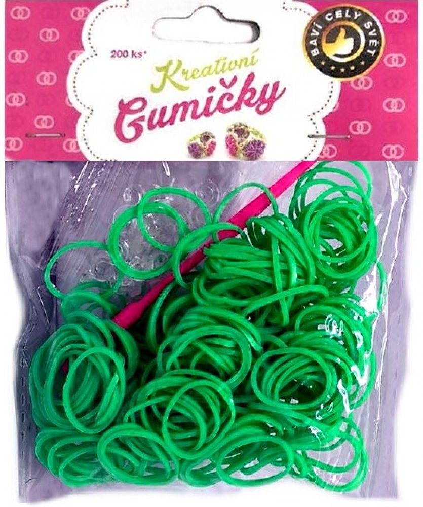 Loom Bands Pletací gumičky zelené 5, 200ks + háček: Buďte originální a vyrobte si svůj vlastní náramek! Sada jednobarevných pruhovaných gumiček s esíčky a pletacím háčkem pro tvorbu náramků.Velice kvalitní gumičky na pletení určené pro tvorbu náramků, zvířátek a mnoho dalšího podle vaší vlastní fantazie.Gumičky, spojky a pletací háček v jednom balení.Obsah balení:200 ks jednobarevných silikonových gumiček1x balíček spojek S1x pletací háčekRozměr balení: 120x90 mmObsahuje malé části, nevhodné pro děti do 3 l
