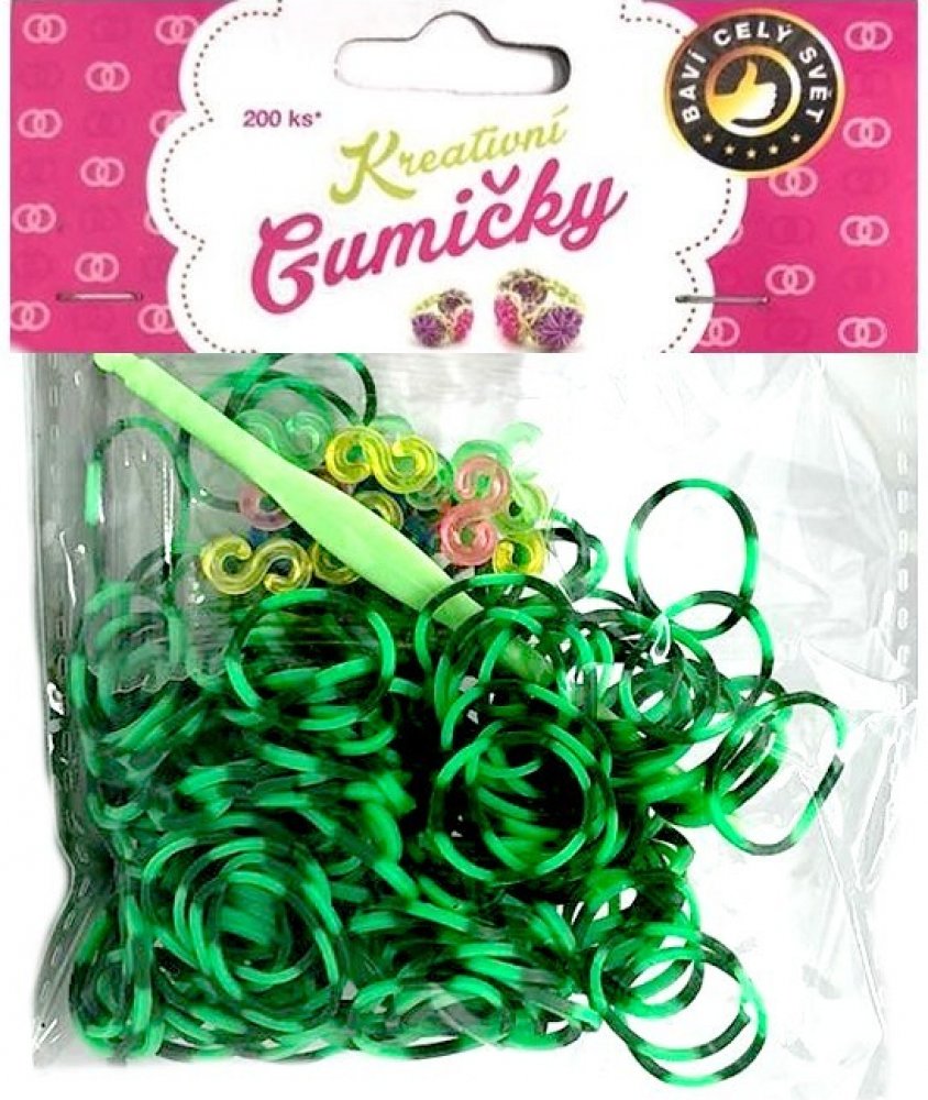 Loom Bands Pletací gumičky pruhované zelené 200ks + háček: Buďte originální a vyrobte si svůj vlastní náramek! Sada různobarevných pruhovaných gumiček s esíčky a pletacím háčkem pro tvorbu náramků.Velice kvalitní gumičky na pletení určené pro tvorbu náramků, zvířátek a mnoho dalšího podle vaší vlastní fantazie.Gumičky, spojky a pletací háček v jednom balení.Obsah balení:200 ks silikonových gumiček1x balíček spojek S1x pletací háčekRozměr balení: 120x90 mmObsahuje malé části, nevhodné pro děti do 3 let.Zdrav