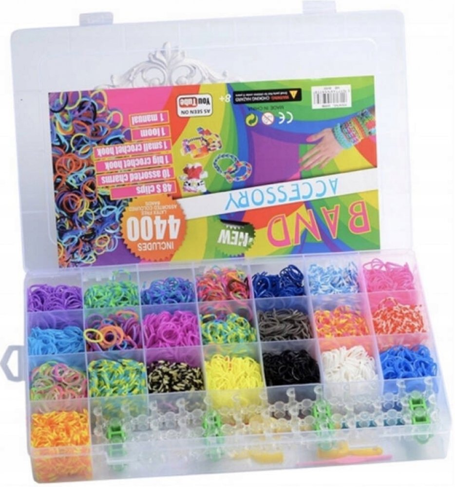 Gumičky jsou vyrobeny z nejkvalitnějších materiálů, díky kterým se při hře nelámou. Sada obsahuje až 4400 gum různých barev. Gumičky podněcují kreativitu, takže můžete vytvořit více než jedno mistrovské dílo, např. šperky nebo figurky.SPECIFIKACE:počet barev: 22počet gumiček: 4400věk: 8+rozměry: 25 × 34,5 × 4 cmhmotnost: 520gObsah balení:4400 gum3 háčky1 tkalcovský stav