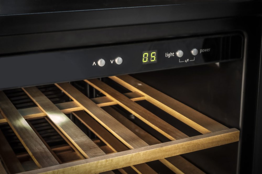 Uvnitř se nachází sedm dřevěných polic, kdy spodní dvě jsou spojené a mají širší rozestupy žebrování pro možnost uložení různých typů lahví. Na výběr té pravé lahve vám posvítí vnitřní LED osvětlení. Díky jednoduchému ovládání s digitálním displejem je nastavení té správné teploty doslova hračka. Pokud náhodou zapomenete zavřít dveře, zvukový signál na to upozorní.