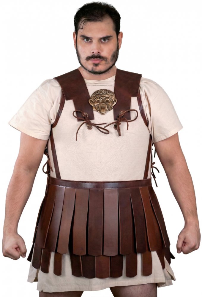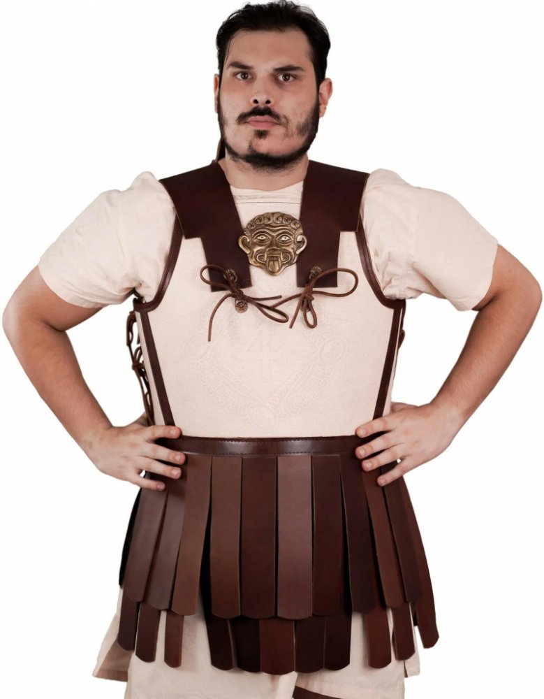 Hrudník tohoto Linothoraxu je ozdoben skličující vizáží Gorgony, která je odlévaná z mosazi, na povrchu patinovaná. Reliéf Gorgony je na hrudní partii nanýtovaný. Integrovaná sukně ze silných kožených pruhů chrání tělo na přední i zadní straně. Brnění se na těle upevňuje šněrováním šňůr přes integrované kroužkové zapínání z patinované mosazi na ramenou a stranách brnění. Pomocí šňůr je možné těsnost sevření v kyrysu upravit dle individuální potřeby nositele.