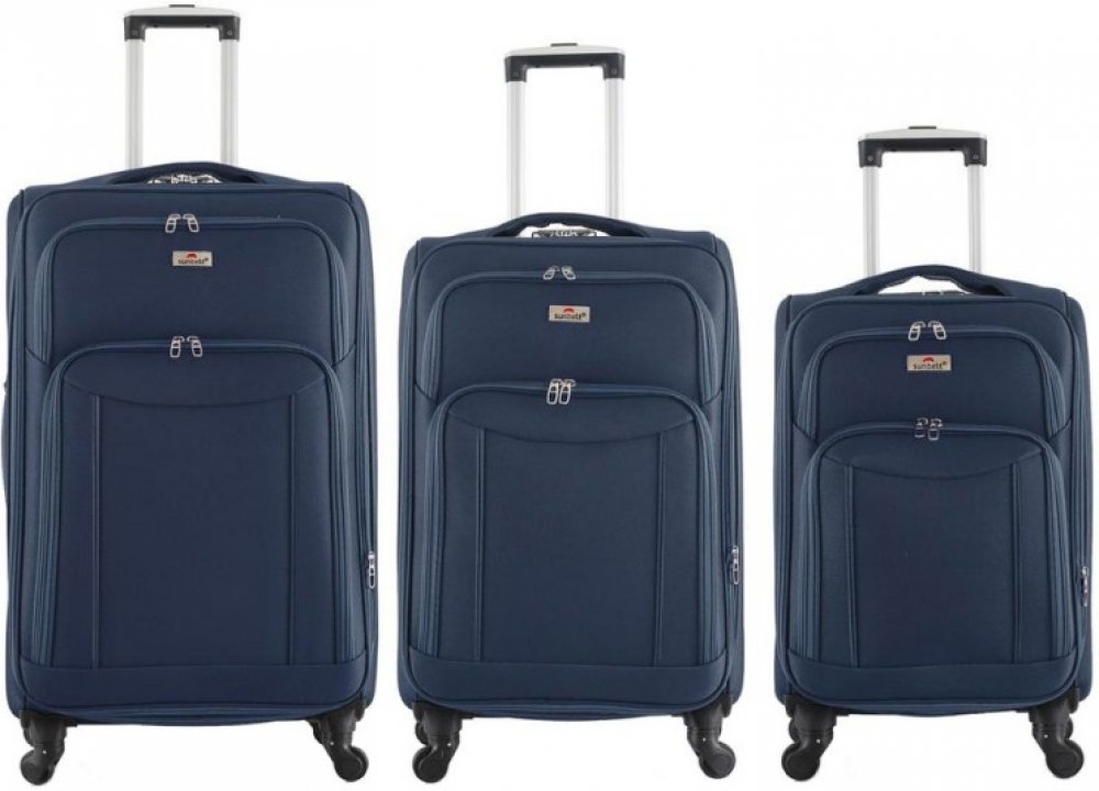 Sada tří látkových cestovních kufrů s expandérem. Sada obsahuje malý, střední a velký kufr na čtyřech kolečkách. Všechny mají rozšiřující se zámek a kombinační zámek.