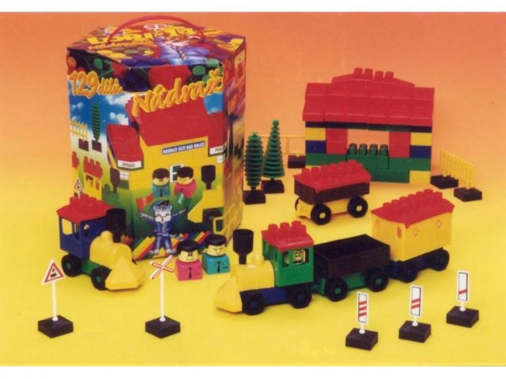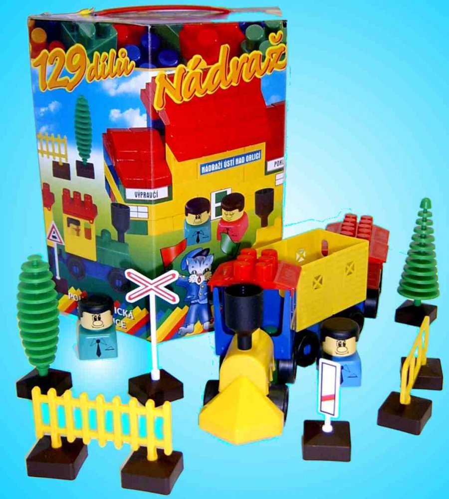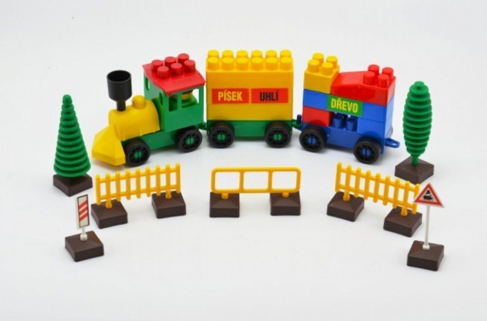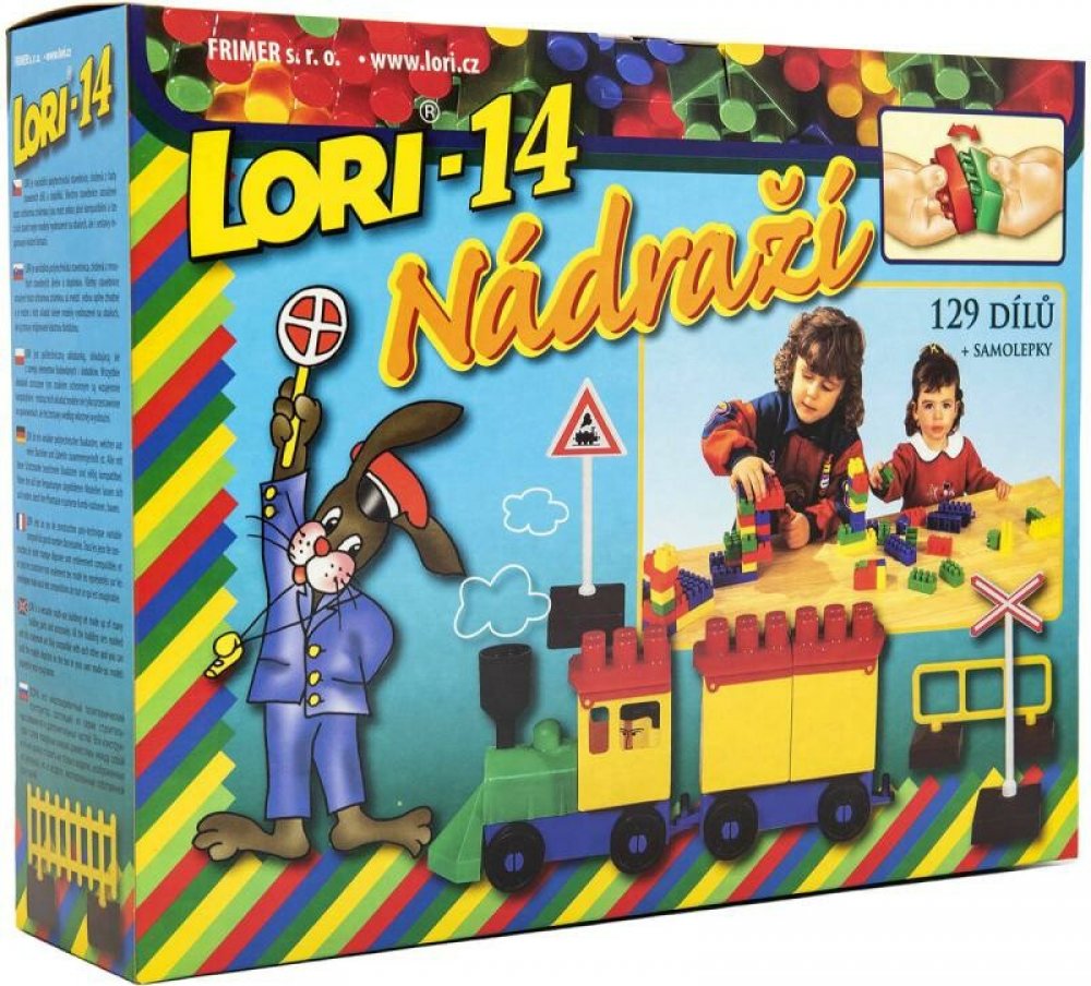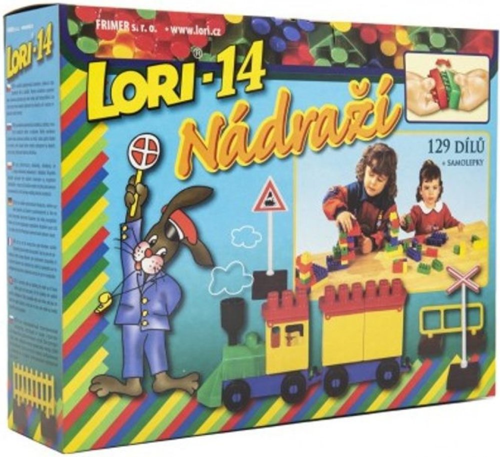 Stavebnice LORI - 14 - Obsahuje vlaky, budovu, ploty, stromy.