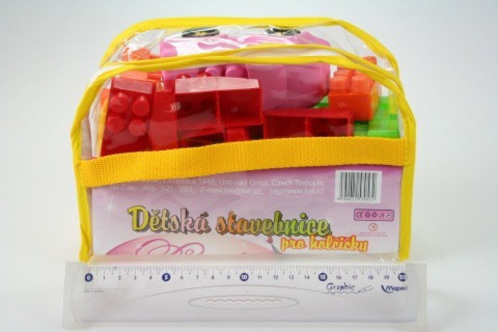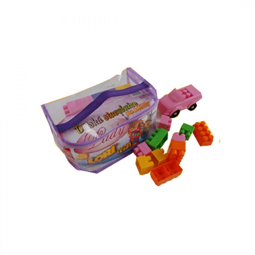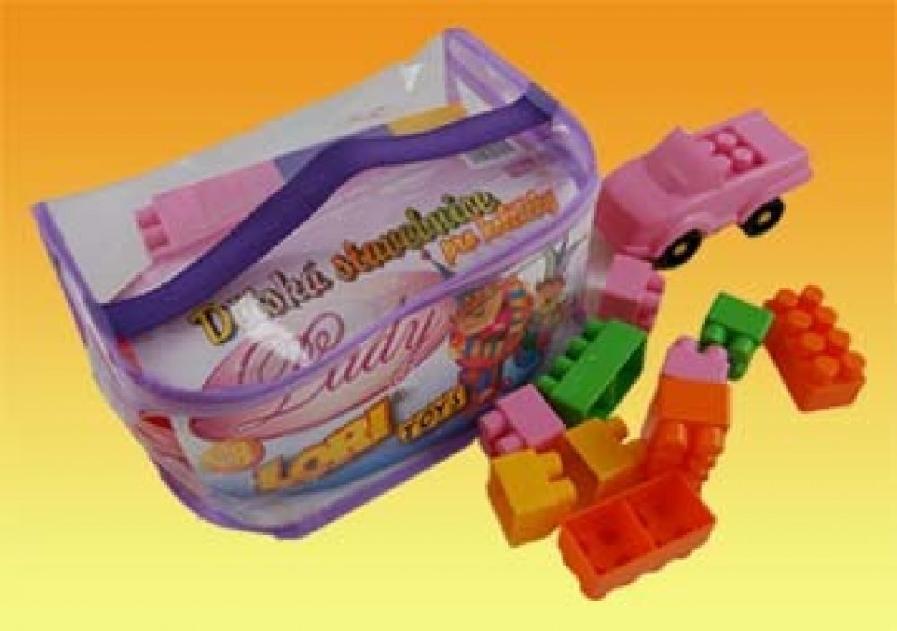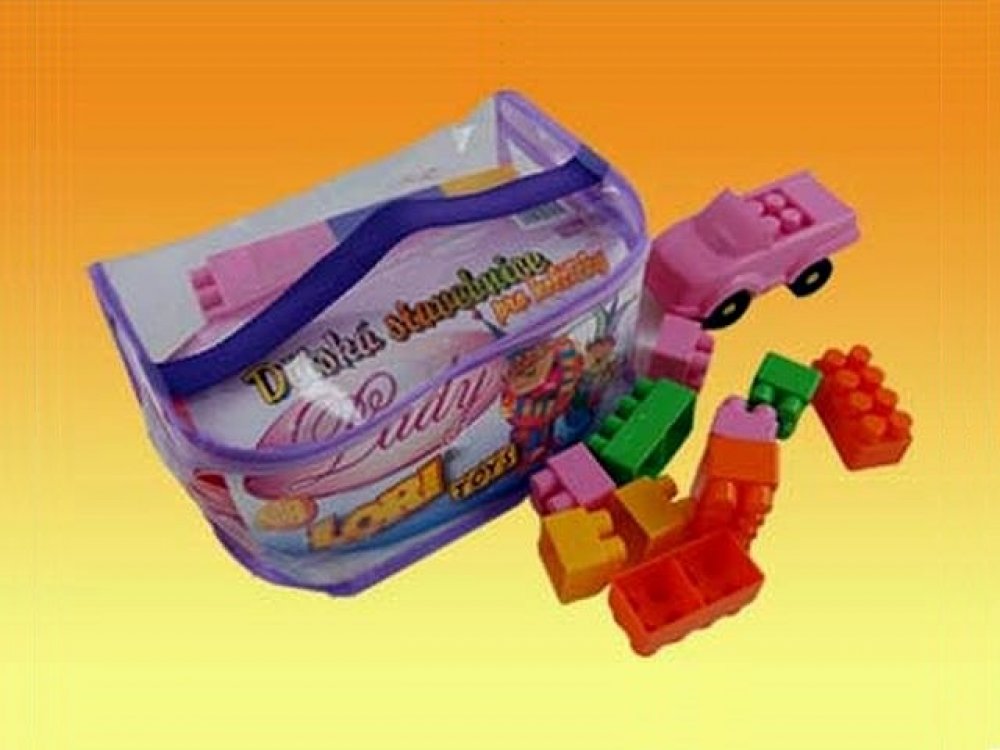 6 typů kostek volených barevně pro malé slečny (růžová, světle zelená, oranžová) + stříšky + růžové autíčko. Baleno v zesílené taštičce. Obsahuje 45 ks kostiček.