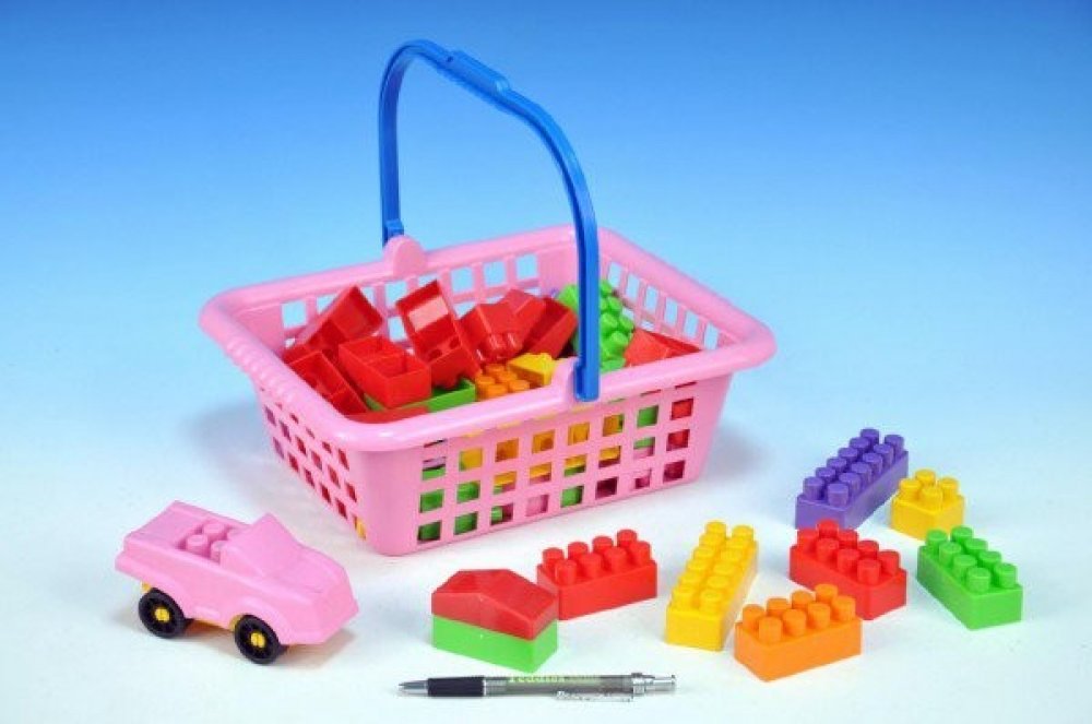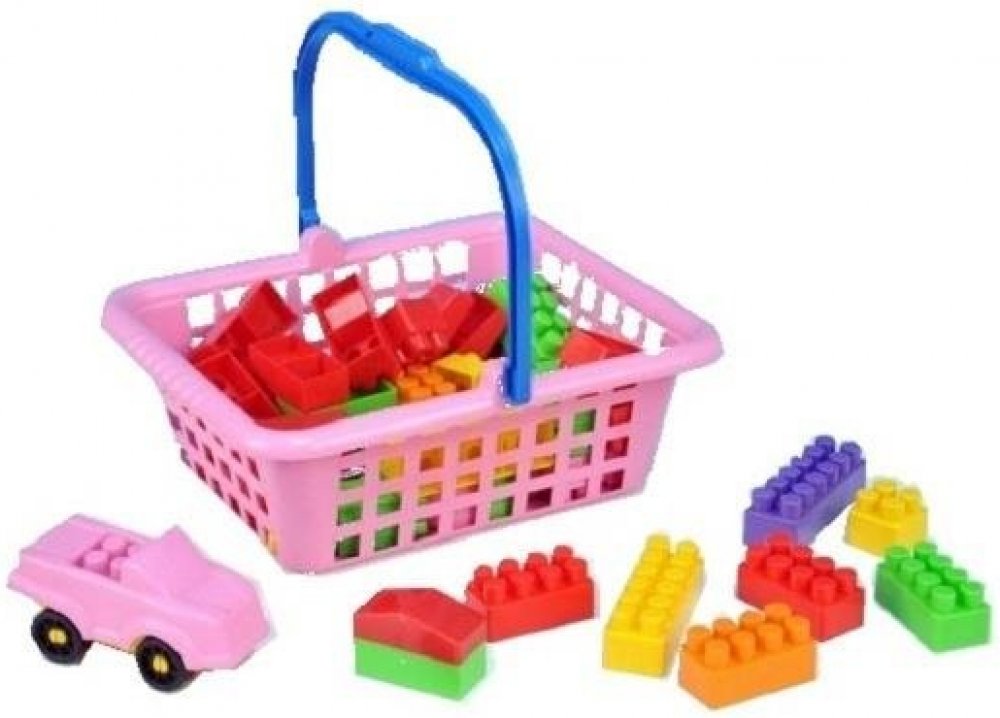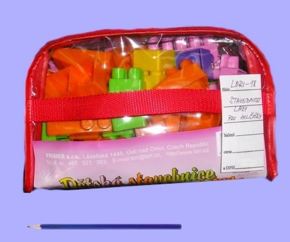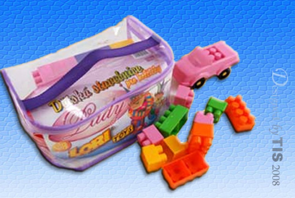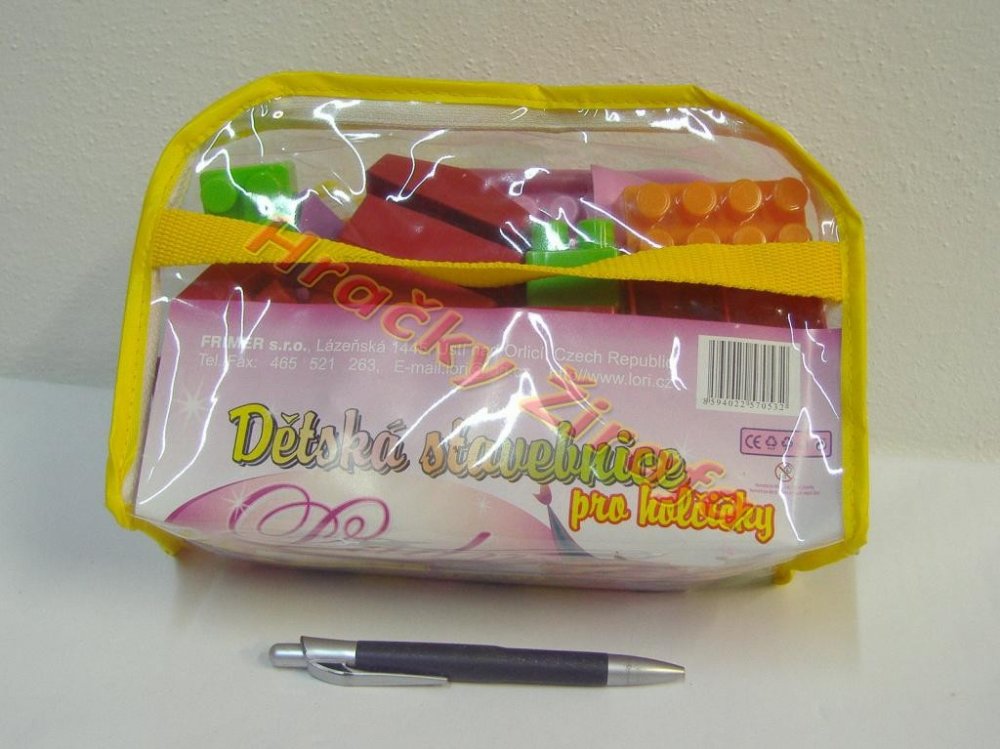 6 typů kostek volených barevně pro malé slečny (růžová, světle zelená, oranžová) + stříšky + růžové autíčko. Baleno v zesílené taštičce. Obsahuje 45 ks kostiček.