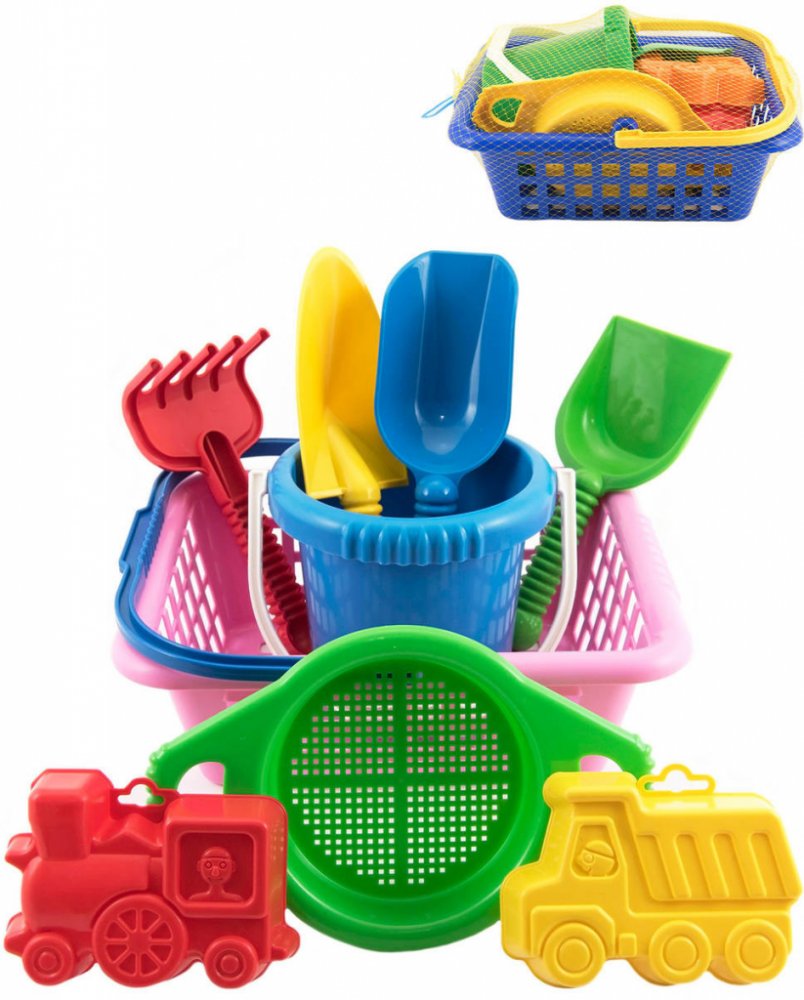 Sada obsahuje: košík, kyblík, sítko, lopatka, hrabičky, kupecká lopatka, 2 bábovky, rýč