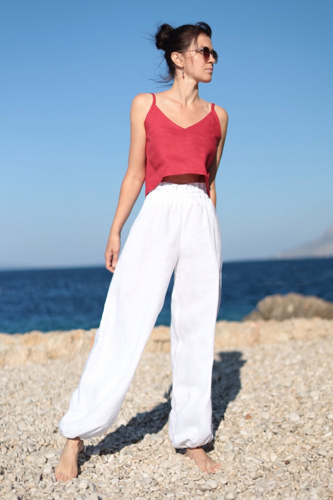 Dámské jednobarevné harémové kalhoty s vysokým pasem, ušité ze 100% lnu, jsou pro Vás navržené a ušité s láskou k přírodě i člověku v českém Podkrkonoší. Kalhoty jsou bez zapínání, řasené v pase do gumy. Široké nohavice jsou díky svému střihu a přírodnímu materiálu ideální pro horké letní dny, nejen pro chvíle aktivního odpočinku nebo dovolené, ale můžete si je bez obav obléct i na neformální schů...