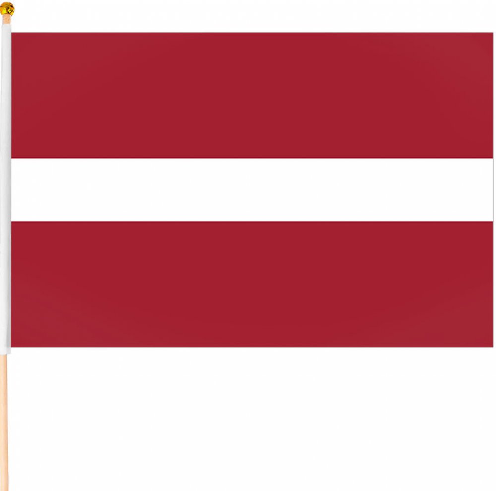 Vlajka Lotyšska o rozměrech 45x30 cm. Legenda o původu vlajky Lotyšska mluví o smrtelně zraněném náčelníkovi Latgalců, který byl zabalen do bílého prostěradla. Část plachty, na které ležel, zůstala bílá, ale dva okraje měl zabarvené krví. Během další bitvy byla krvavá plachta použita jako vlajka a údajně bitvu Latgalci vyhráli. Vlajka je připevněna na držadle délky 61 cm a zakončena plastovou zlatou kuličkou. Na výrobu vlajky byl použit polyester. Vlajka je vhodná jako dekorace do bytu, do podniku či jako symbol během fandění.