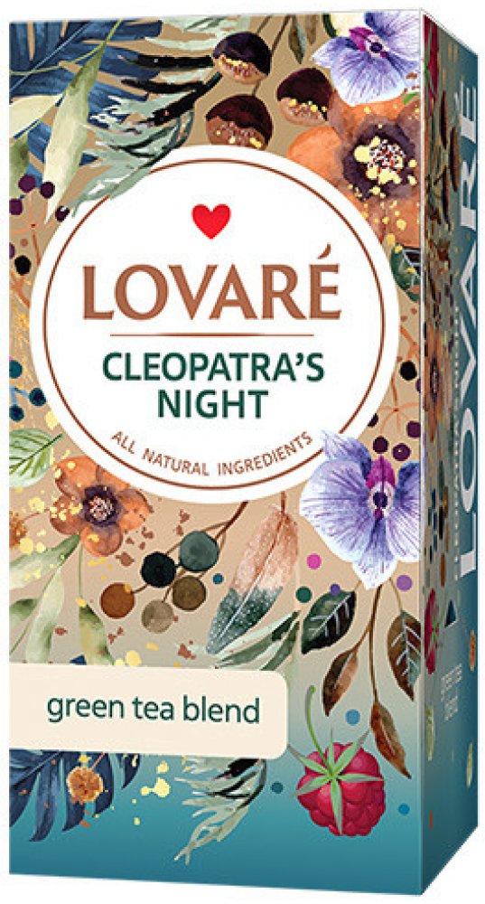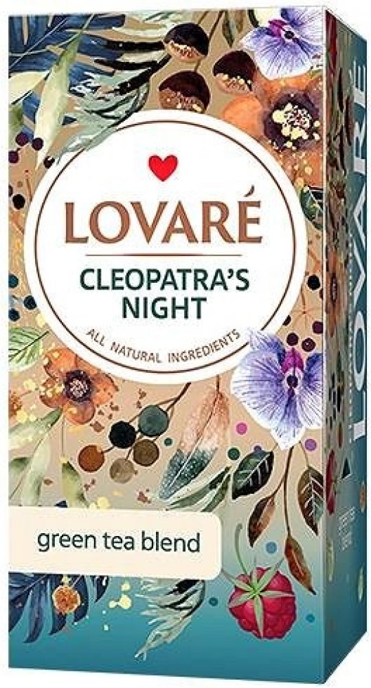 - Zelený čaj LOVARÉ Cleopatra’s Night spojuje čínský zelený dlouholistý čaj s lahodným ovocným - malinovým symfonickým dojmem. Čaj přináší svou charakteristickou svěžest a jemný zelený profil, zatímco maliny v podílu 5 % přidávají nápoji osvěžující sladkost s lehkou kyselinkou. Ananas a jablko, tvořící 1 % směsi, zvýrazňují ovocný rozmach s pikantními tóny. Okvětní lístky světlice barvířské, růže, chrpy polní a měsíčku lékařského dodávají nápoji nejen vizuální krásu, ale i jemnou květinovou esenci. Přírodní malinová příchuť prohlubuje a zvýrazňuje sladkost malin, vytvářející bohatou a svůdnou chuťovou paletu.