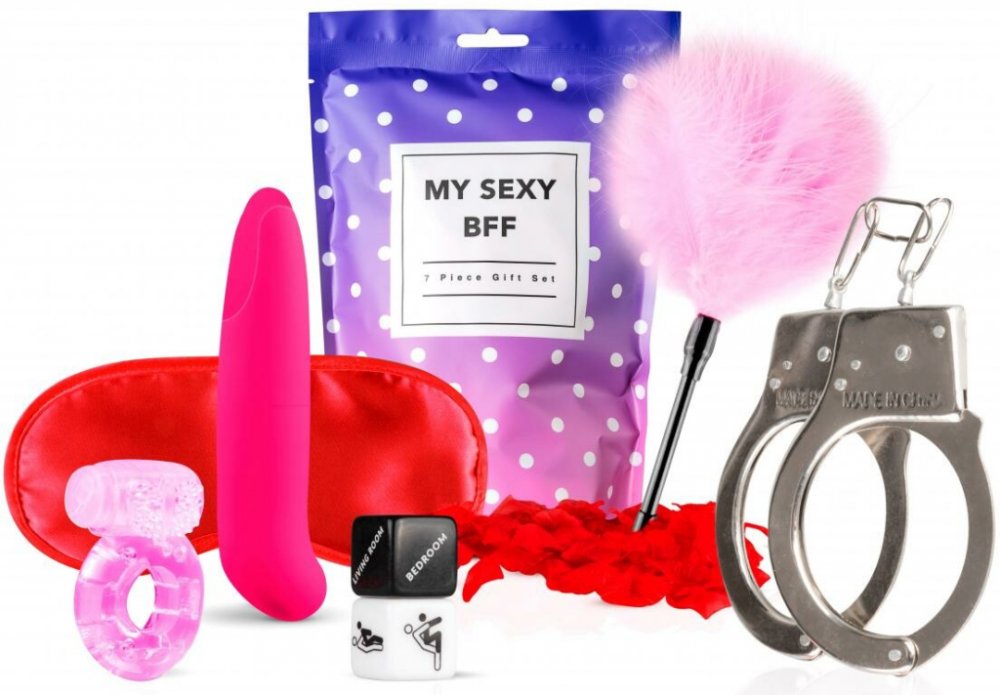 Objev nové rozměry vášně s LoveBoxxx My Sexy BFF 7dílnou sadou s vibrátorem, která ti nabídne vše, co potřebuješ pro vzrušující a pestré chvíle ve dvou i o samotě!Proč si ji zamiluješ?Pestrá rozkoš - Různé hračky v sadě ti umožní stimulovat intimní partie různými způsoby a znásobit potěšení.Zážitky ve dvou - S vibračním erekčním kroužkem a sexy kostkami můžete objevovat nové formy společného uspokojení.Hravé objevování - Peříčkový šimrátko a maska na oči přidávají vzrušení do předehry i her na role.Na co mrknout:Do vibrátoru budeš potřebovat 1 AA baterii, která není součástí balení, musíš ji pořídit zvlášť.Baterie ve vibračním kroužku nelze vyměnit.Na čištění hraček použij vlažnou vodu s jemným mýdlem nebo speciální čistič erotických pomůcek.Obsah sady se může mírně lišit, hodnota zůstává stejná.Balení obsahuje:Vibrátor: Pevný materiál, jednostupňová vibrace, zaoblený a lehce zahnutý tvar, růžová barva.Vibrační erekční kroužek: Měkký a pružný silikon s částí pro stimulaci klitorisu, jednostupňová vibrace, průsvitná růžová.Kovová pouta: Stříbrná barva, krátké řetízkové spojení, bezpečnostní páčka pro rychlé otevření.Sexy kostky (2 ks): Černá kostka určená pro výběr místa na sex (anglicky), bílá kostka ukazuje polohu (obrázky).Peříčkový šimrátko: Měkká růžová pírka, krátká černá plastová rukojeť.Maska na oči: Červená, měkký a lesklý materiál s elastickou gumičkou kolem hlavy.Růžové okvětní lístky: Červené, měkké umělé lístky pro dekoraci.Vlastnosti produktu:Vibrátor: Celková délka cca 12 cm; průměr cca 2,5 cm; materiál: ABS plast.Vibrační erekční kroužek: Vnitřní průměr je elastický; materiál: silikon.Kovová pouta: Nastavitelná velikost; materiál: kov.Sexy kostky: Velikost cca 2,5 x 2,5 cm; materiál: plast.Peříčkový šimrátko: Celková délka cca 20 cm; materiál: peří a plast.Maska na oči: Univerzální velikost; materiál: polyester.Růžové okvětní lístky: Počet cca 100 ks; materiál: plast.