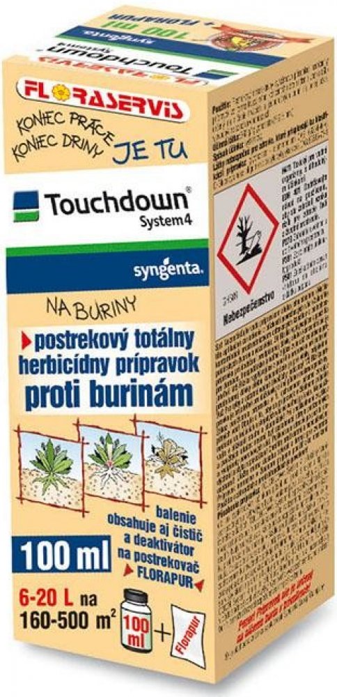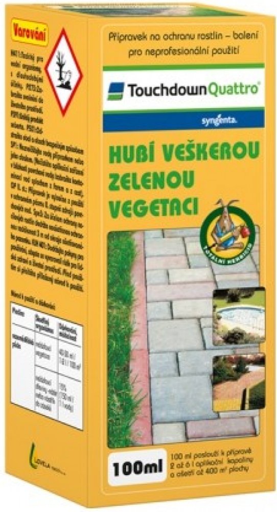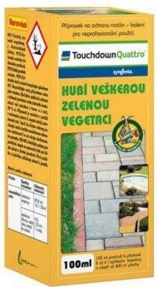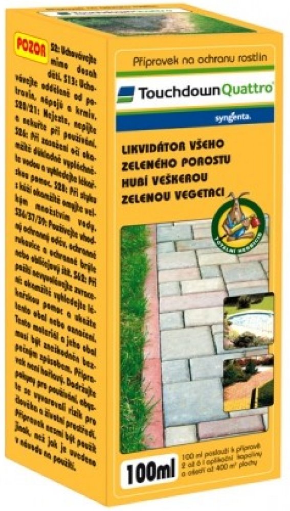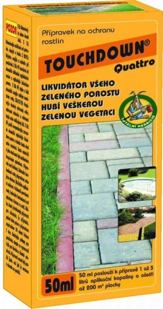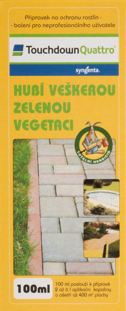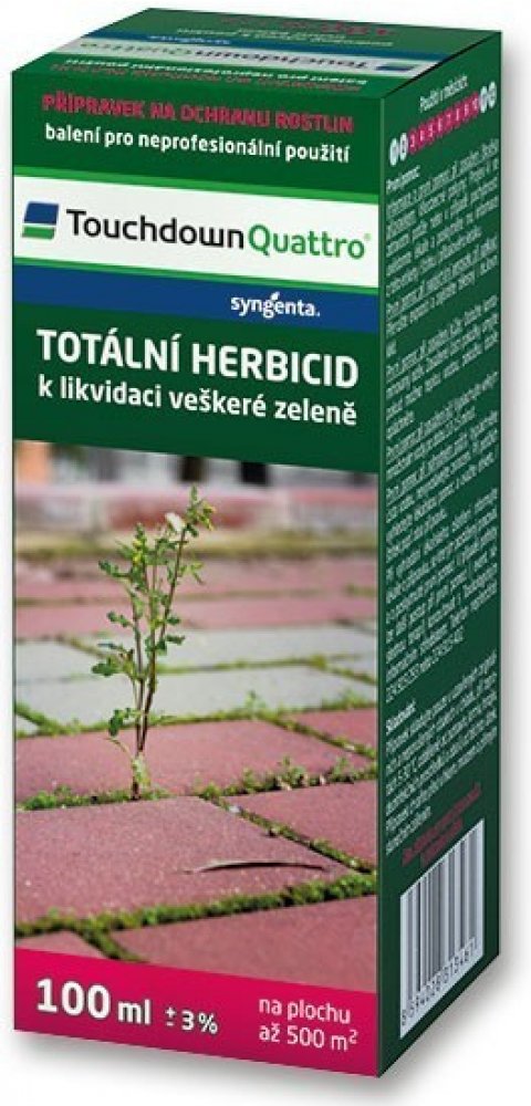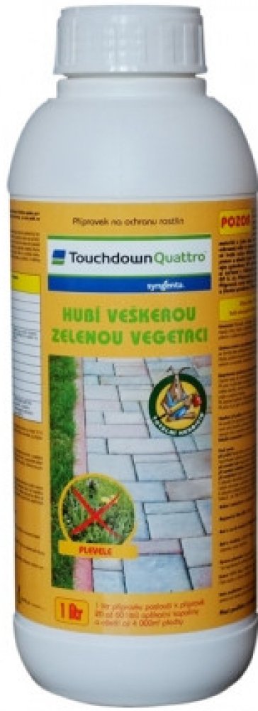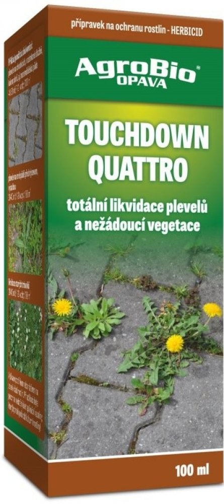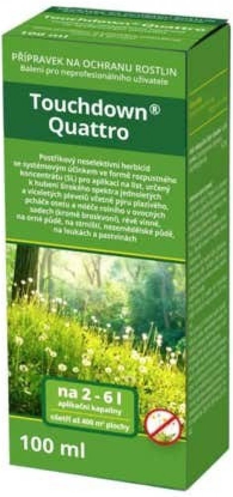 Touchdown Quattro je postřikový neselektivní herbicid se systémovým účinkem ve formě rozpustného koncentrátu pro aplikaci na list, určený k hubení širokého spektra jednoletých a víceletých plevelů včetně pýru plazivého, pcháče osetu a mléče rolního v ovocných sadech (kromě broskvoní), révě vinné, na orné půdě, na strništi, nezemědělské půdě, na loukách a pastvinách.