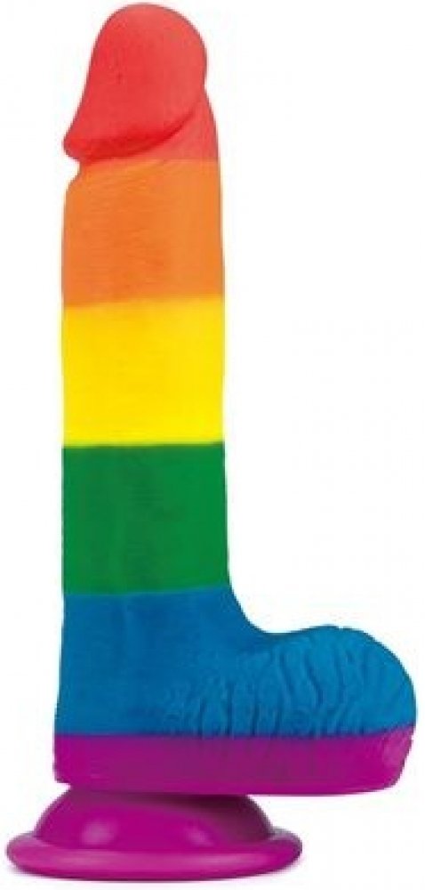 Duhové, rovné dildo s varlaty, z lékařského silikonu, opatřeno silnou přísavkou pro upevnění na hladký povrch. Celková délka 19 cm, použitelná délka 14,5 cm, průměr max. 3,5 cm.