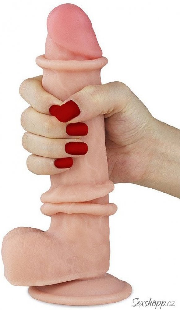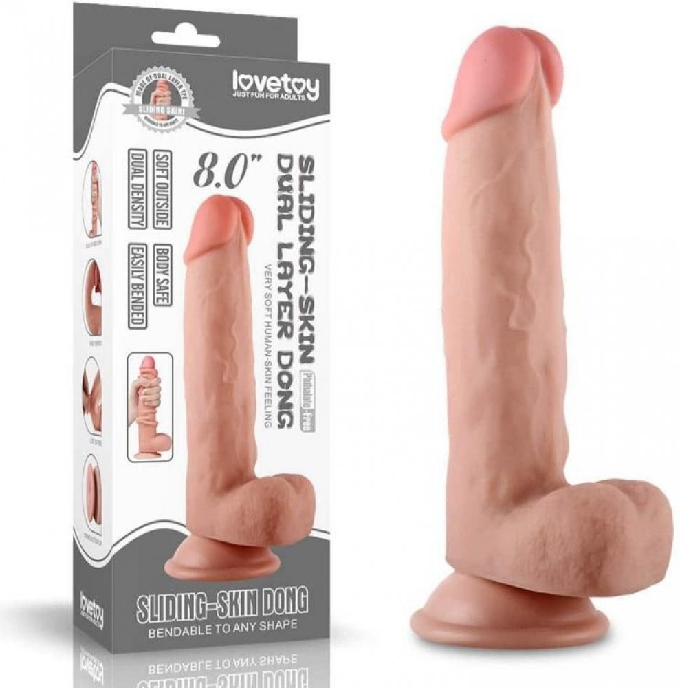 Realistické dildo LoveToy Sliding-Skin Dual Layer Cock 8" 20 cm s varlaty a přísavkou pro spoustu vzrušující zábavy. Kombinace pevného jádra a měkkého vnějšího povrchu (dual density design) dokonale simuluje pocit vztyčeného penisu.