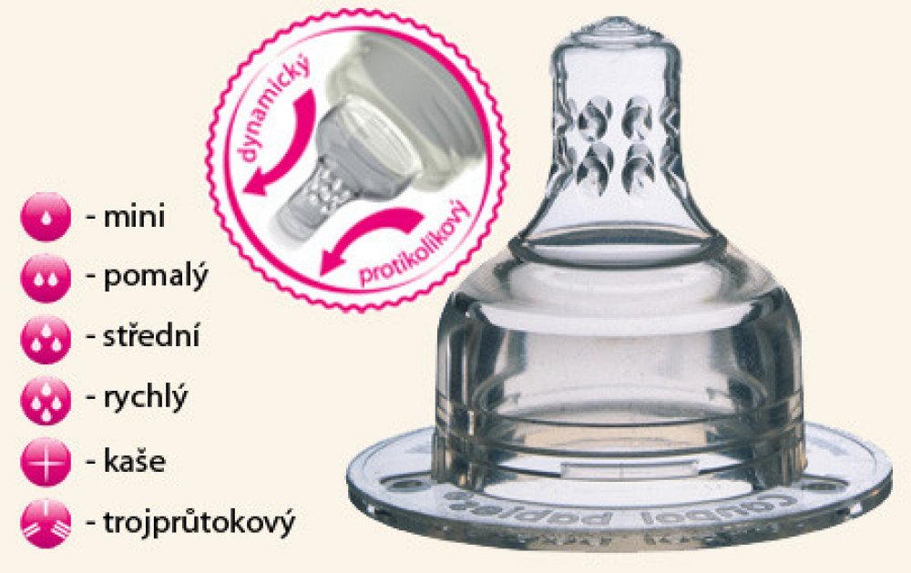 - Protikolikový dudlík – unikátní systém odvzdušňování dudlíku minimalizuje možnost vzniku dětské koliky.