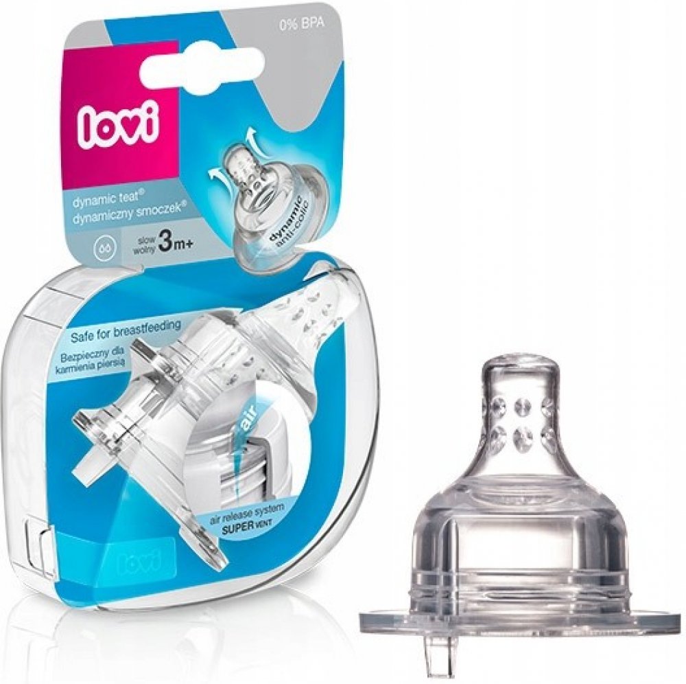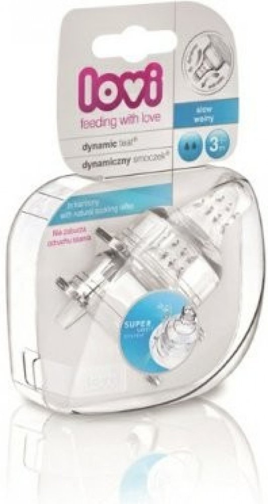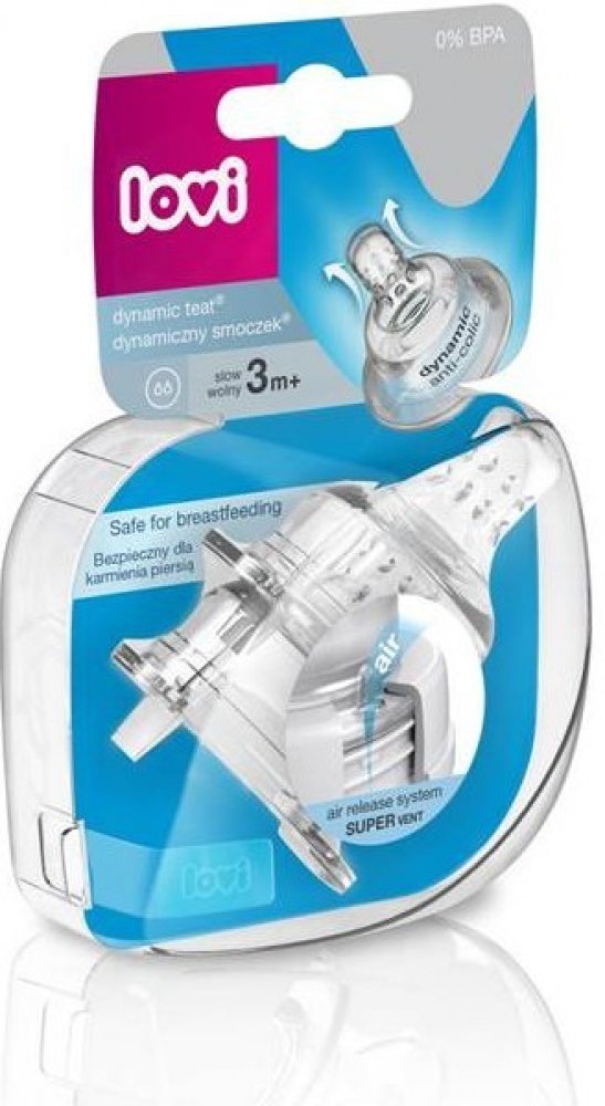 Dynamická savička LOVI je vyrobená z nestejnorodých vrstev silikonu. V průběhu krmení modifikuje svůj tvar (prodlužuje se), přizpůsobuje se rytmu a síle sání dítěte podobně jako matčina bradavka při kojení. Systém vnitřních otvorů vytvořených podle modelu laktačních kanálků reguluje (zpomaluje) průtok pokrmu a stimuluje dítě k aktivnímu sání. Umožňuje kombinovat kojení a krmení z lahve. V balení 2...