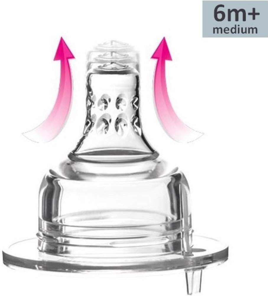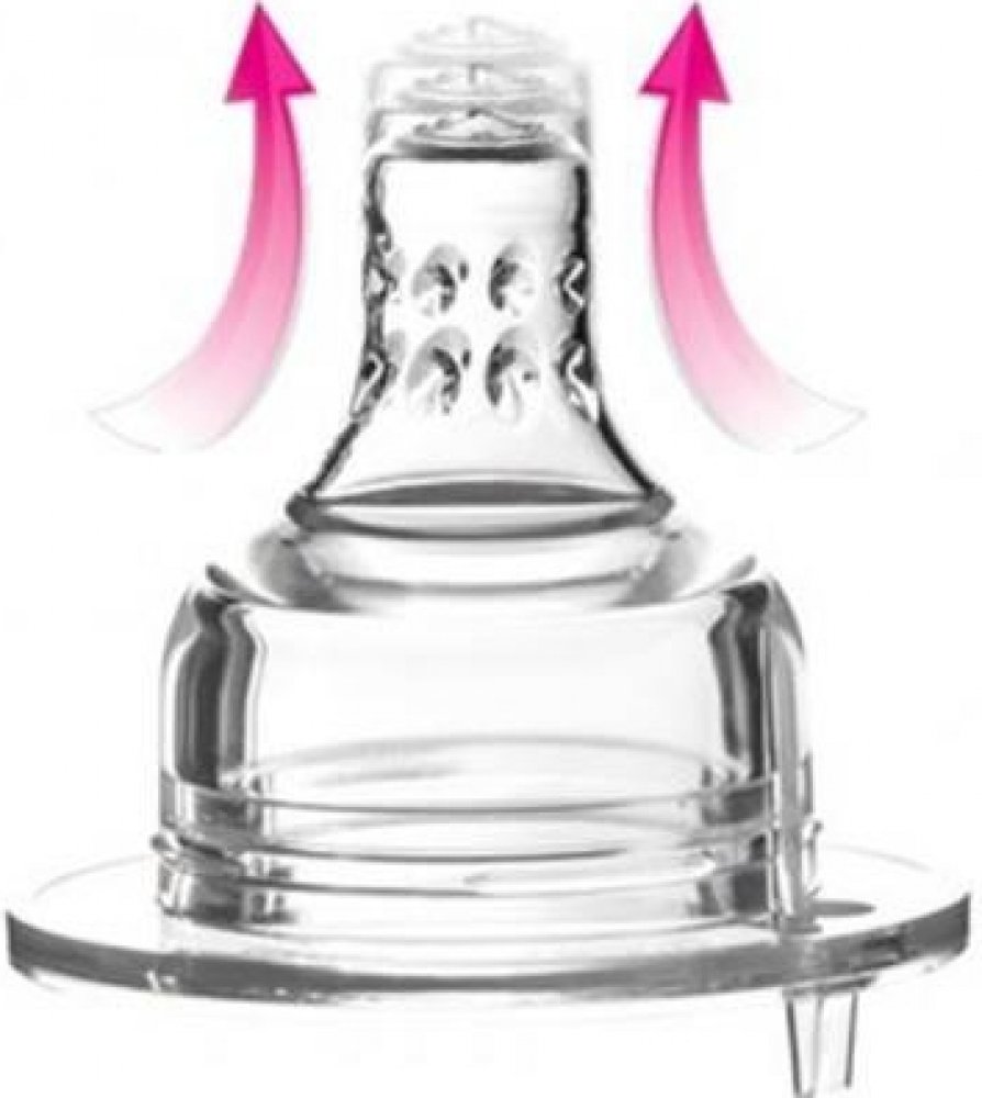 Systém vnitřních otvorů vytvořených podle modelu laktačních kanálků reguluje (zpomaluje) průtok pokrmu a stimuluje dítě k aktivnímu sání. Umožňuje kombinovat kojení a krmení z láhve.
