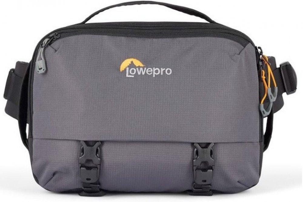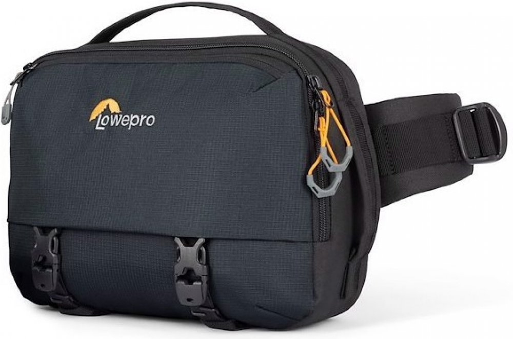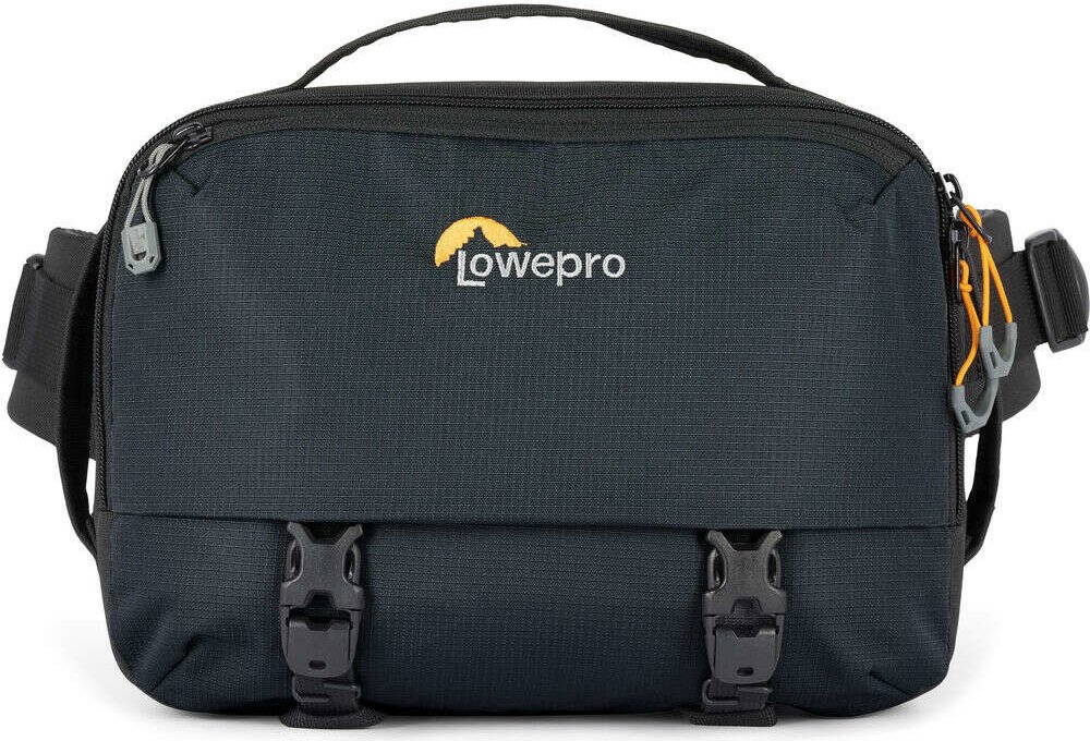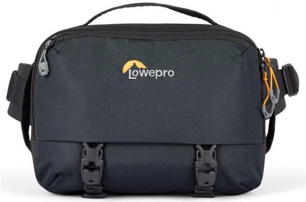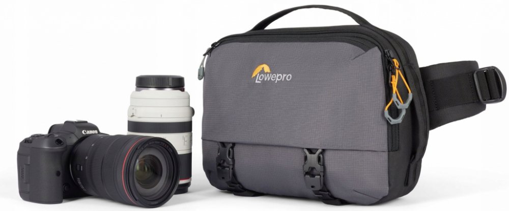 Černá sling taška Lowepro Trekker Lite SLX 120 pojme bezzrcadlovku s nasazeným objektivem, plus dva další objektivy nebo jeden objektiv 70-200mm uložený horizontálně v tašce. Alternativně může pojmout skládací dron, jako je DJI Mavic Pro, s příslušenstvím.