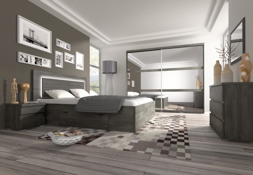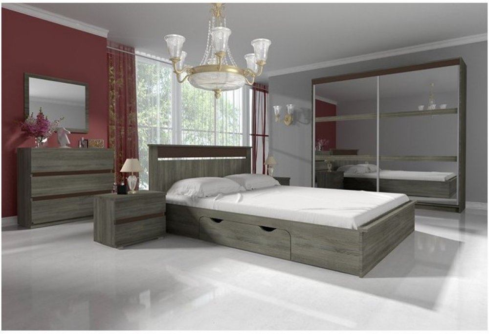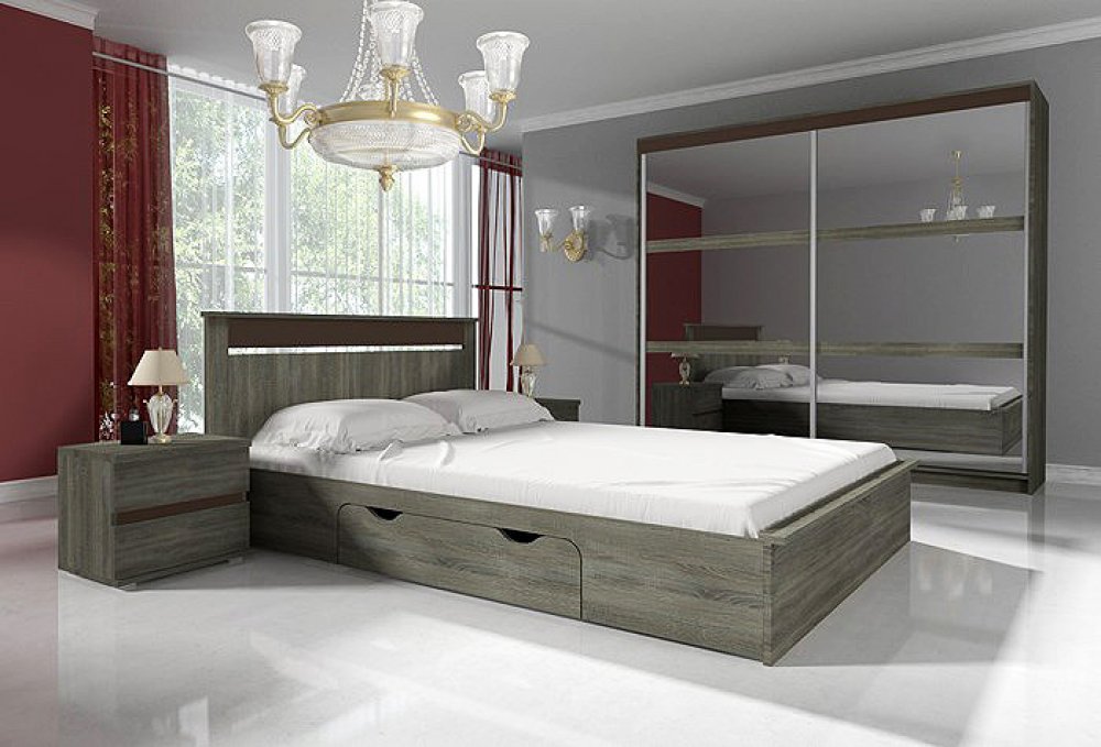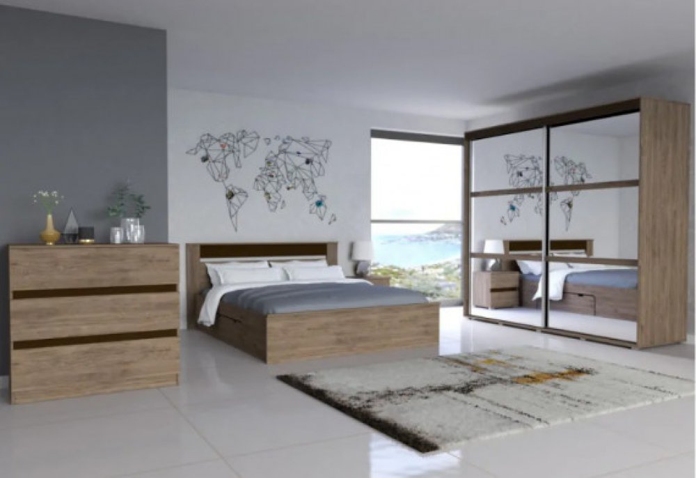 Ložnice LATTE je vyrobena v atraktivních barvách dub sonoma lanýž/dub bahenní a černá borovice norská. Nabízí prostornou šatní skříň s posuvnými dveřmi, komodu s třemi zásuvkami, postel s úložným prostorem, noční stolek a zrcadlo. Je vyrobena z kvalitních materiálů.